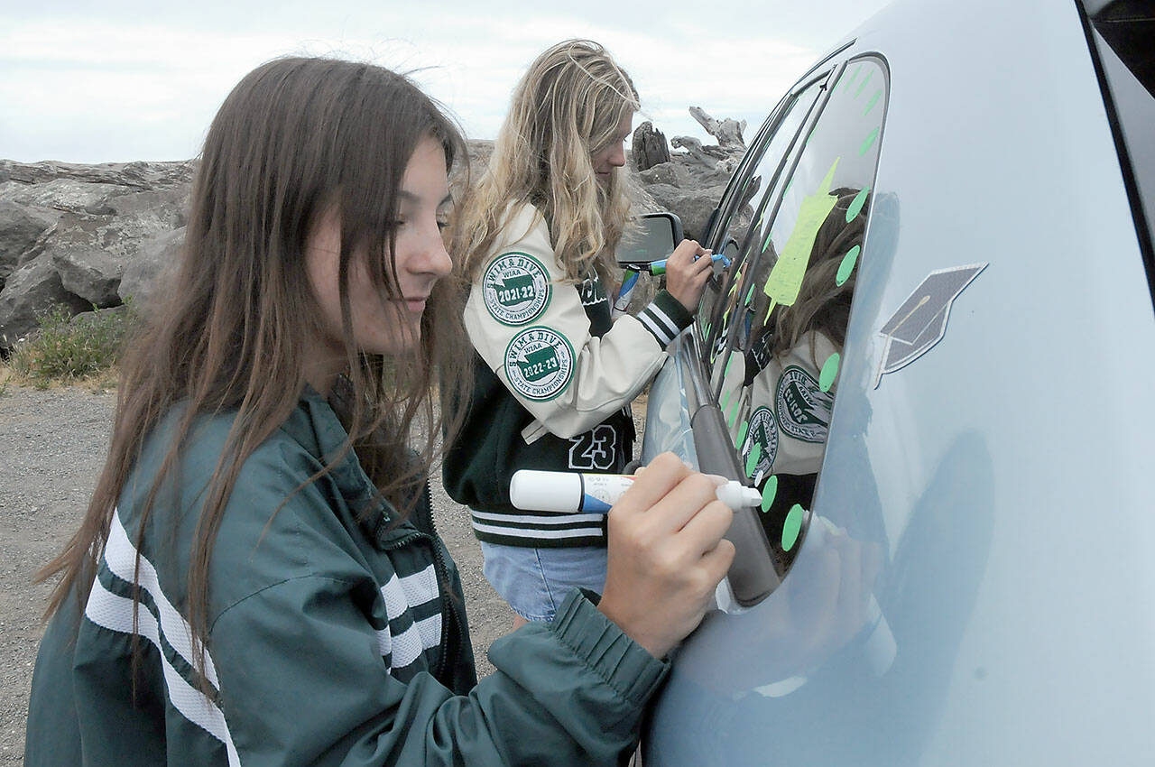 Port Angeles High School graduates Natalie Johnson, front, and Rachel Cooper decorate the windows of a car prior to the start of Friday’s Graduation Parade. About 100 vehicles with graduates, family and friends took part in the procession from Ediz Hook to Port Angeles High School. (Keith Thorpe/Peninsula Daily News)