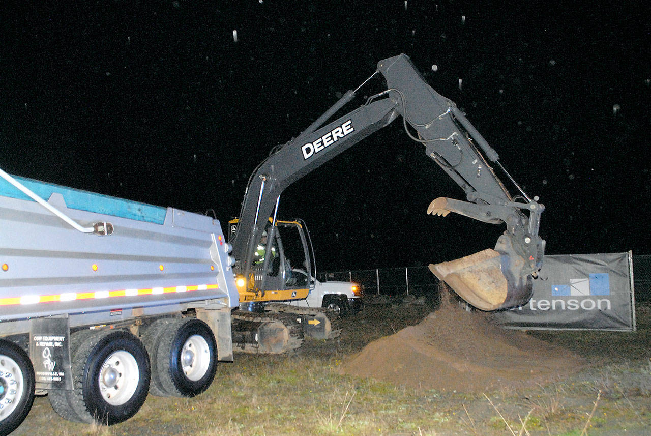 PORT ANGELES — Construction of the envisioned Field Arts & Events Hall kicked off with a roar Friday evening as an excavator lifted a ceremonial scoop of dirt to officially start the project.