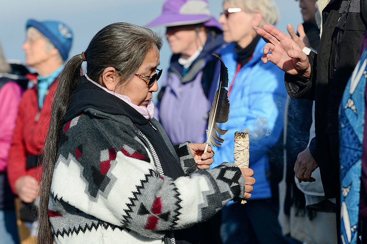 As the 60 people at the Elwha River stood in a circle and prayed, Sheryl Charging Whirlwind went around the group, smudging everyone with sage smoke and an eagle feather.