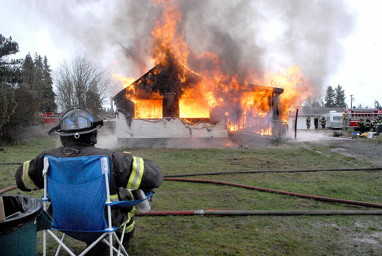 Firefighter/paramedic Erik Sundin sits in a folding chair to watch a house at 2354 E. Fifth Ave., in the Gales Addition east of Port Angeles, go up in flames on Sunday as part of a training exercise for personnel of Clallam County Fire District 2. The donated house was torched to allow firefighters to hone their skills over a two-day session that culminated in destruction of the structure. Once extinguished, the charred remains will be cleared to make way for future development. (Keith Thorpe/Peninsula Daily News)