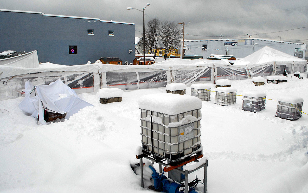 When organizers came to the site Wednesday morning, the 40-foot by 140-foot tent, owned by 7 Cedars Casino and made available for the ice village project, had collapsed in the middle with a broken spine and sagging sides. Other smaller tents at the village site were also crumpled under a thick blanket of snow.