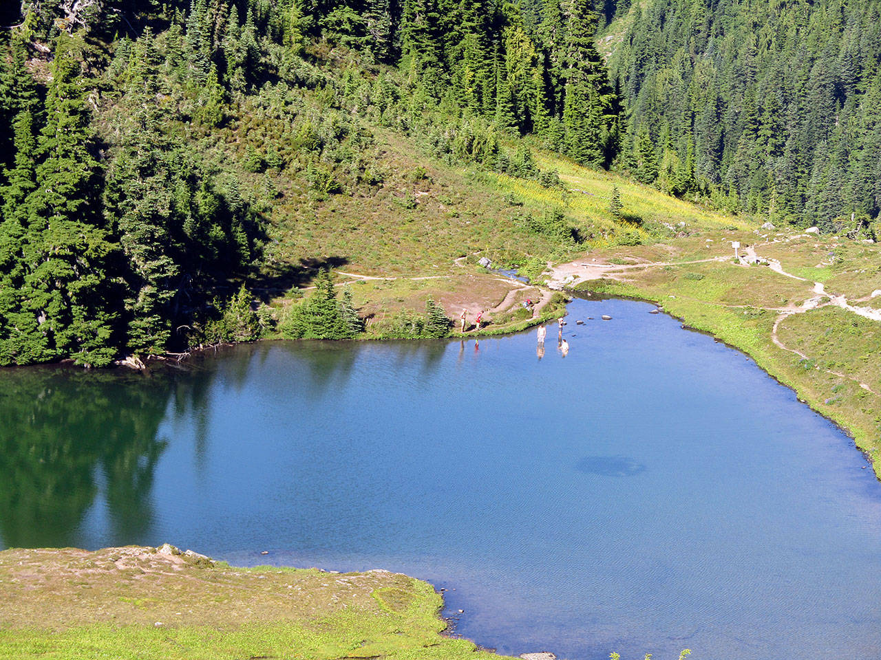 The trail leaves the alpine meadows at Heart Lake and descends 3.5 miles into the Sol Duc basin, passing several campsites and crossing the river on a tall footbridge.