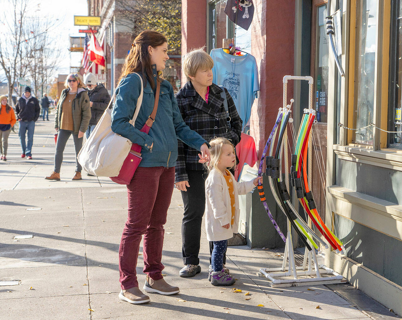 Everly Odell, 3, is captivated by the colorful bows outside a shop on Water Street in downtown Port Townsend on Small Business Saturday. She is accompanied by mom Allison Odell and nana Gail Danner, all from Port Townsend. (Steve Mullensky/for Peninsula Daily News)