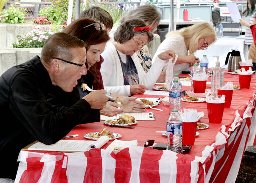 The Port Angeles hot dog eating contest, sponsored by The Red Lion Hotel, was held in the pavilion of the Gateway Transit Center. The six contestants — four men, one woman and one girl — competed to see who could eat 12 hot dogs the fastest. After it appeared no one would finish the entire tray, a 1:40 p.m. deadline was set.