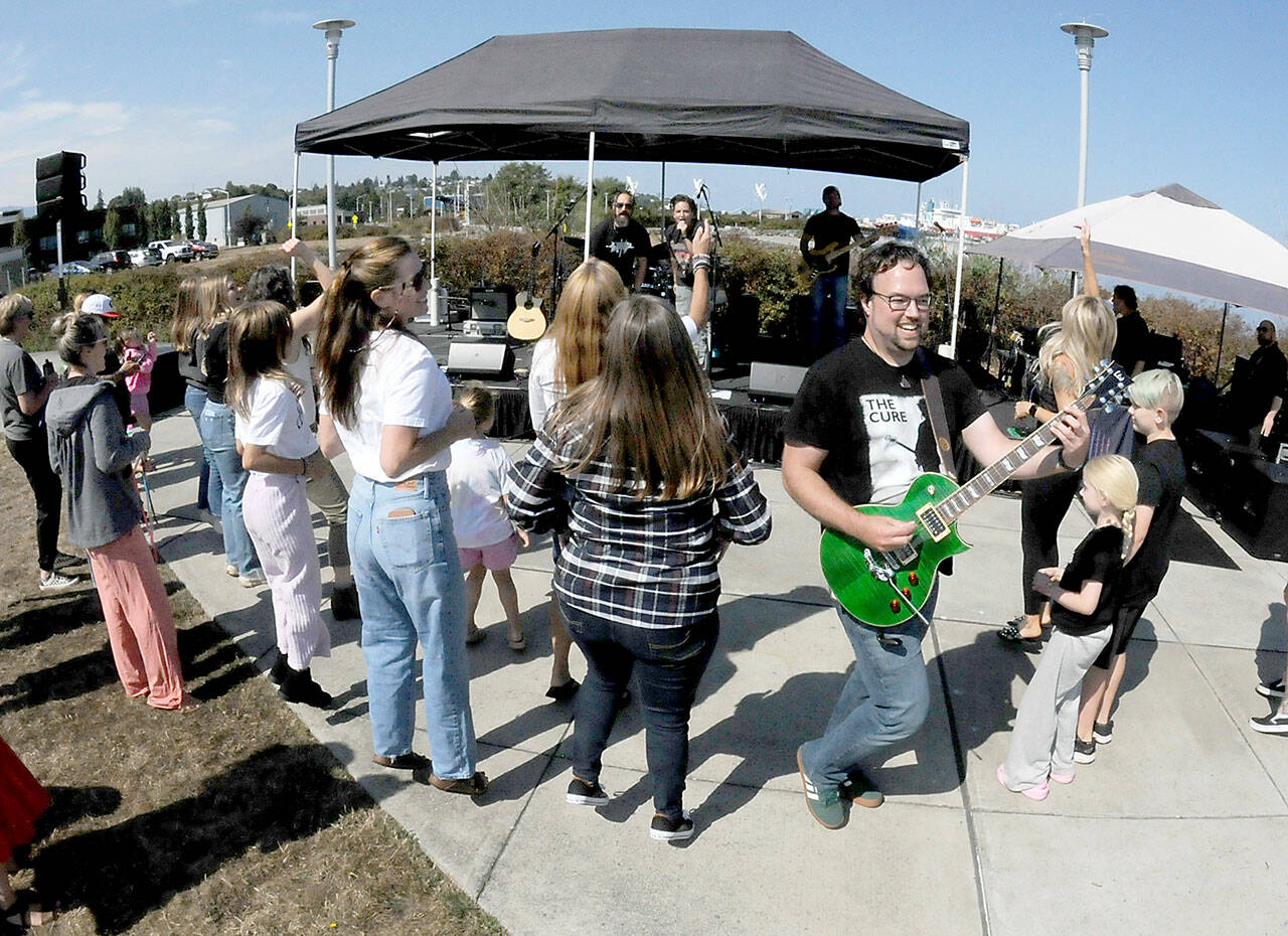 Guitarist Branden Bettger of the Sequim-based group SuperNostalgic, right front, cavorts through the audience as he plays during Saturday’s Jammin’ in the Park at Pebble Beach Park in Port Angeles. The event, hosted by the Rotary Club and Koenig Subaru, featured an afternoon of music, a car show, food and children’s activities. (Keith Thorpe/Peninsula Daily News)