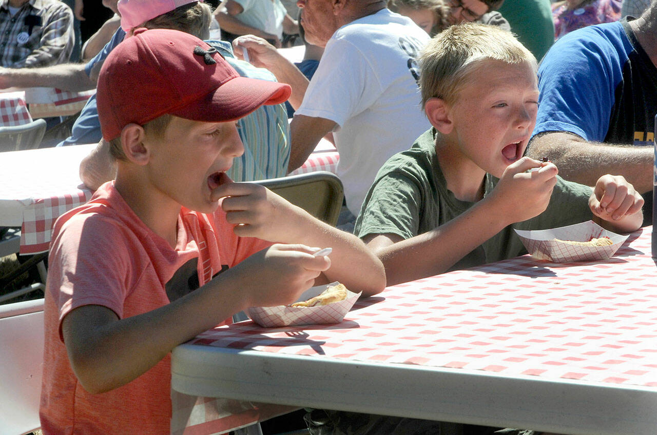 Carson Grooms, 9, left, and brother Kaleb Grooms, 11, both of Joyce, eat pie at Saturday’s Joyce Daze festival. (Keith Thorpe/Peninsula Daily News)