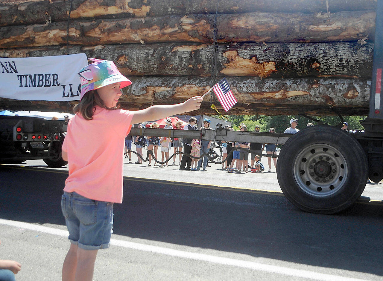 Ariel Gordob, 8, of Black Lake wakes a small flag as a log truck passes in the Joyce Daze Grand Parade on Saturday. (Keith Thorpe/Peninsula Daily News)