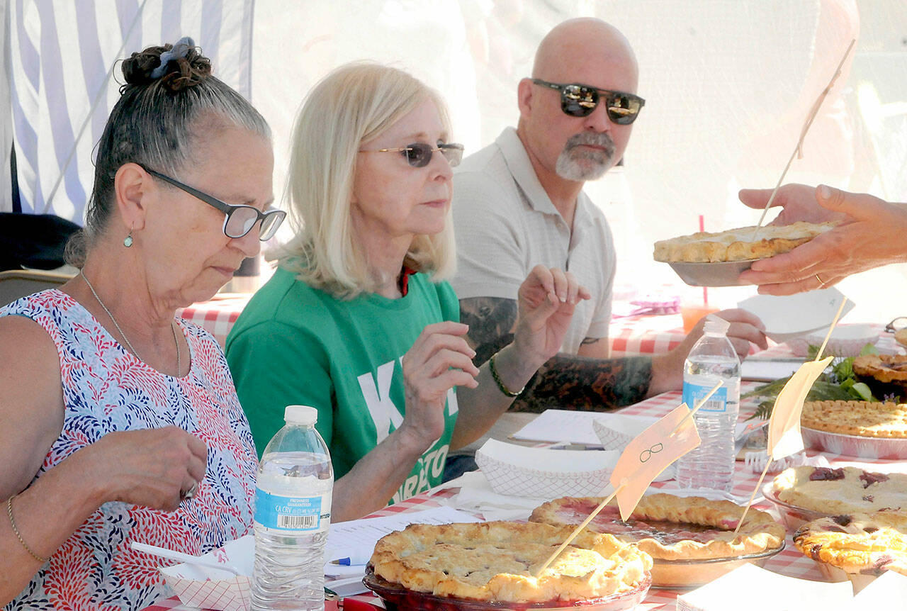 Blackberry pie judges, from left, Blackberry Cafe owner Roxanne Olsen, former Port Angeles Mayor Cherie Kidd and Peninsula Daily News publisher Terry Ward watch as another contest entry is presented to them on Saturday. (Keith Thorpe/Peninsula Daily News)