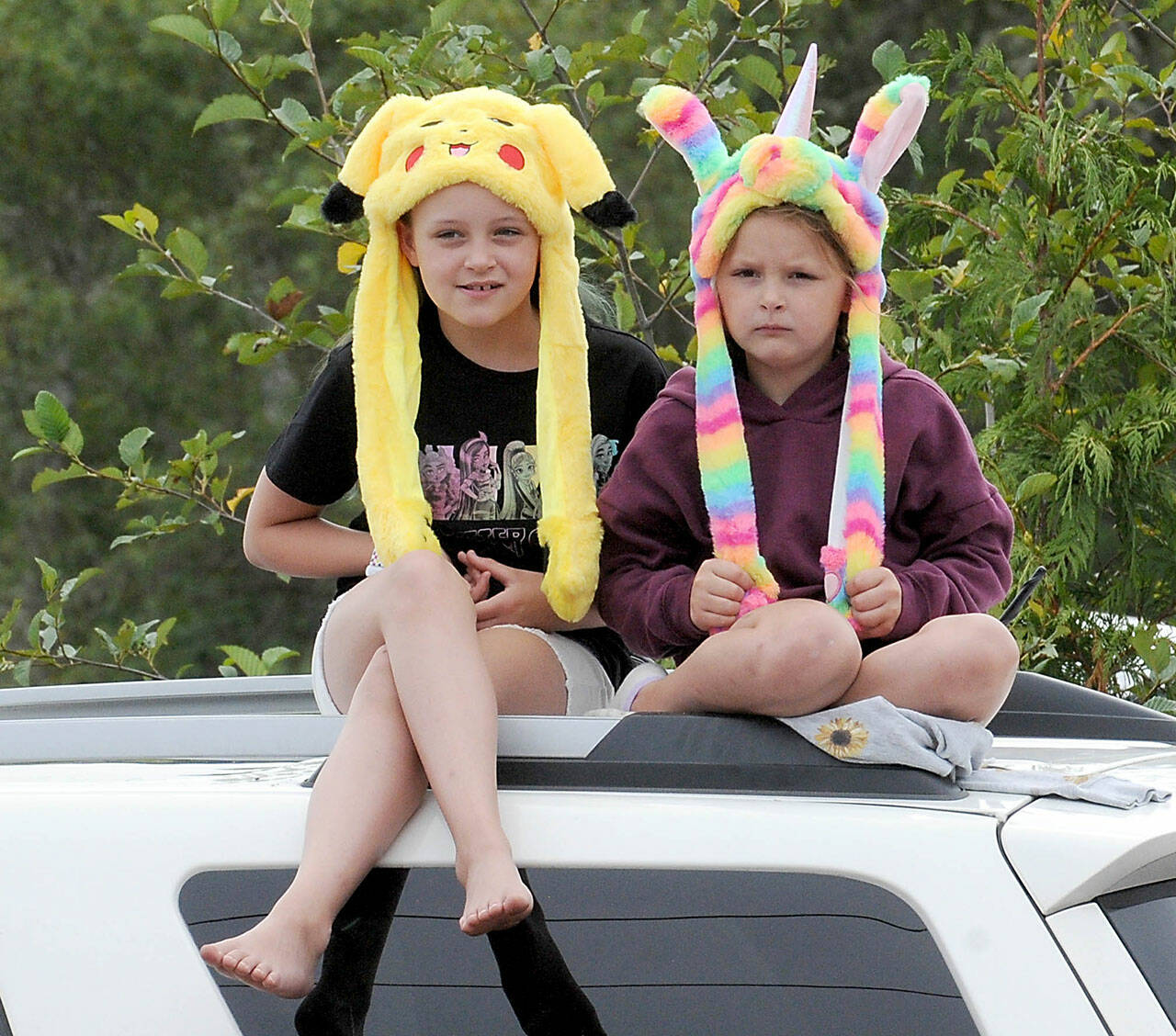 Sisters Addi Helgeson, 9, left, and Kammi Helgeson, 7, both of Port Angeles, watch the Joyce Daze grand parade from the top of a van along the parade route on Saturday. (Keith Thorpe/Peninsula Daily News)