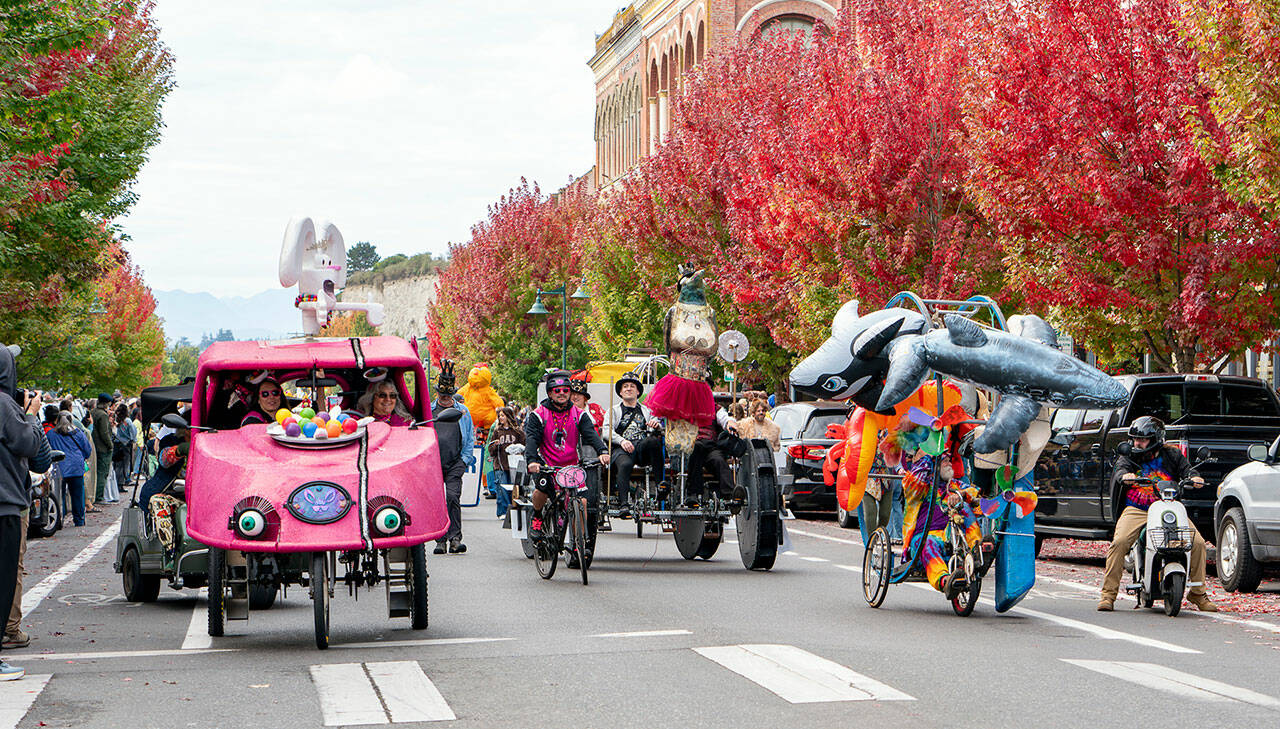 A massive kinetic skulpture called Maxtivity’s GLORY-ous Chocolate Turtle from Corvallis, Ore., negotiates a turn on Water Street during the 40th Kinetic Skulpture Parade and Race in downtown Port Townsend on Saturday.