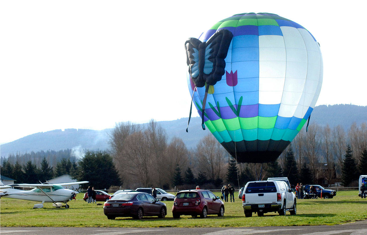 The 95-year-old Port Angeles man took a tethered balloon ride with Capt. Crystal Stout, executive director of Dream Catcher Balloon, at Sequim Valley Airport on Saturday.