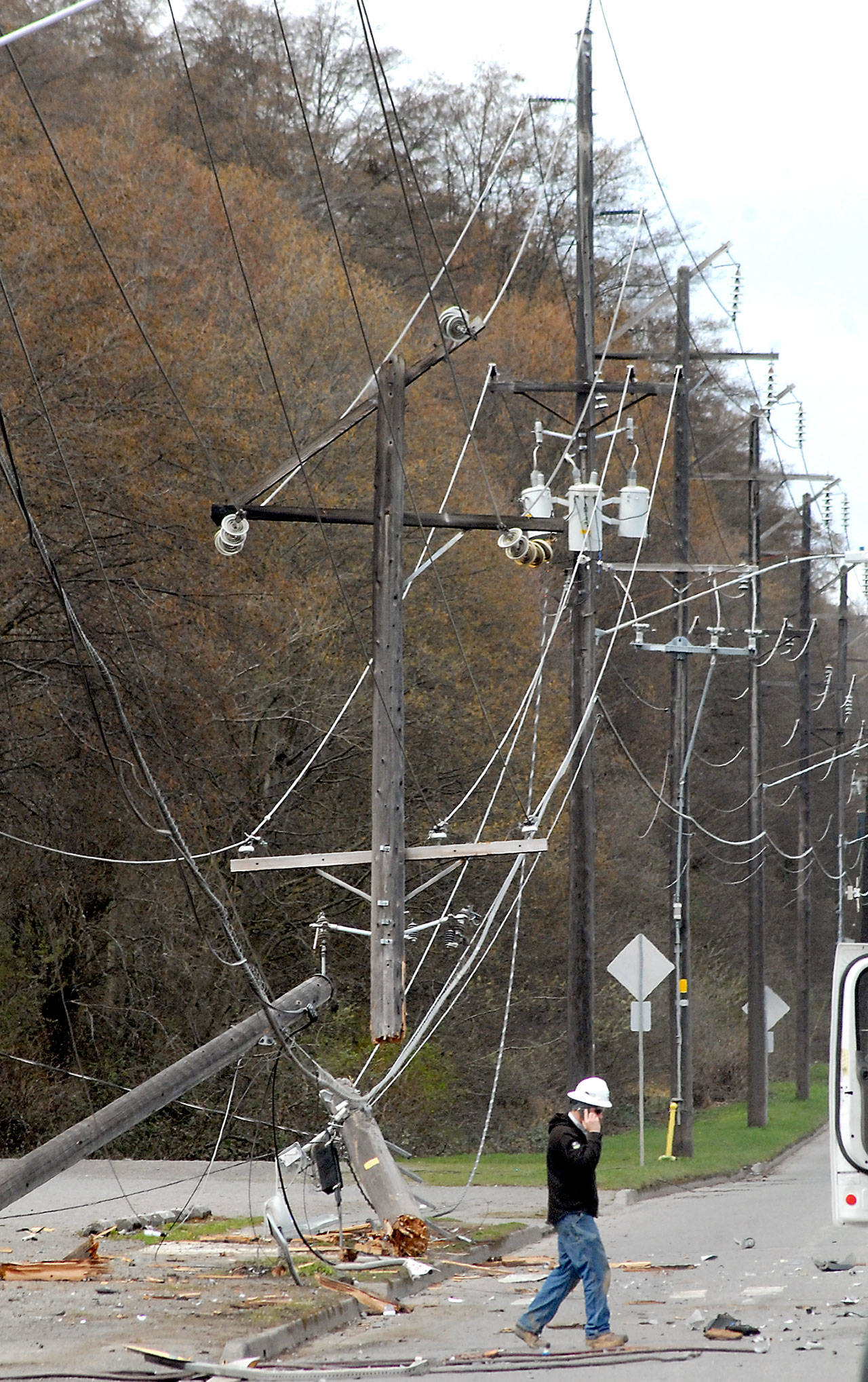 The collisions damaged 69,000-volt and 13,000-volt transmission lines and a Wave cable and broadband company communications line, Fulton said.