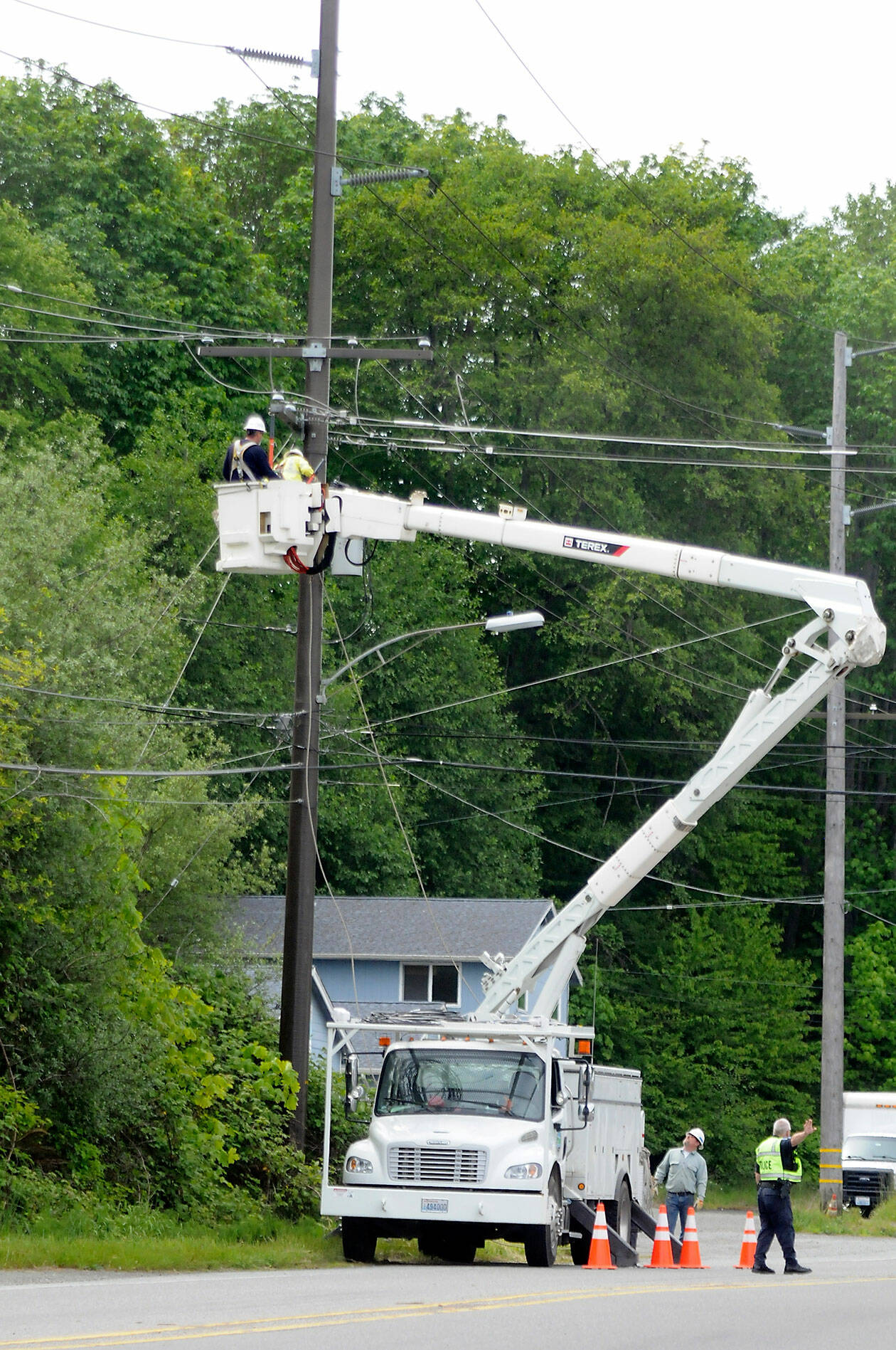 PORT ANGELES — A tree falling down a steep slope pulled down power lines on West Marine Drive in Port Angeles on Thursday morning, cutting power to about 120 electrical customers and prompting a road closure while utilities were repaired.