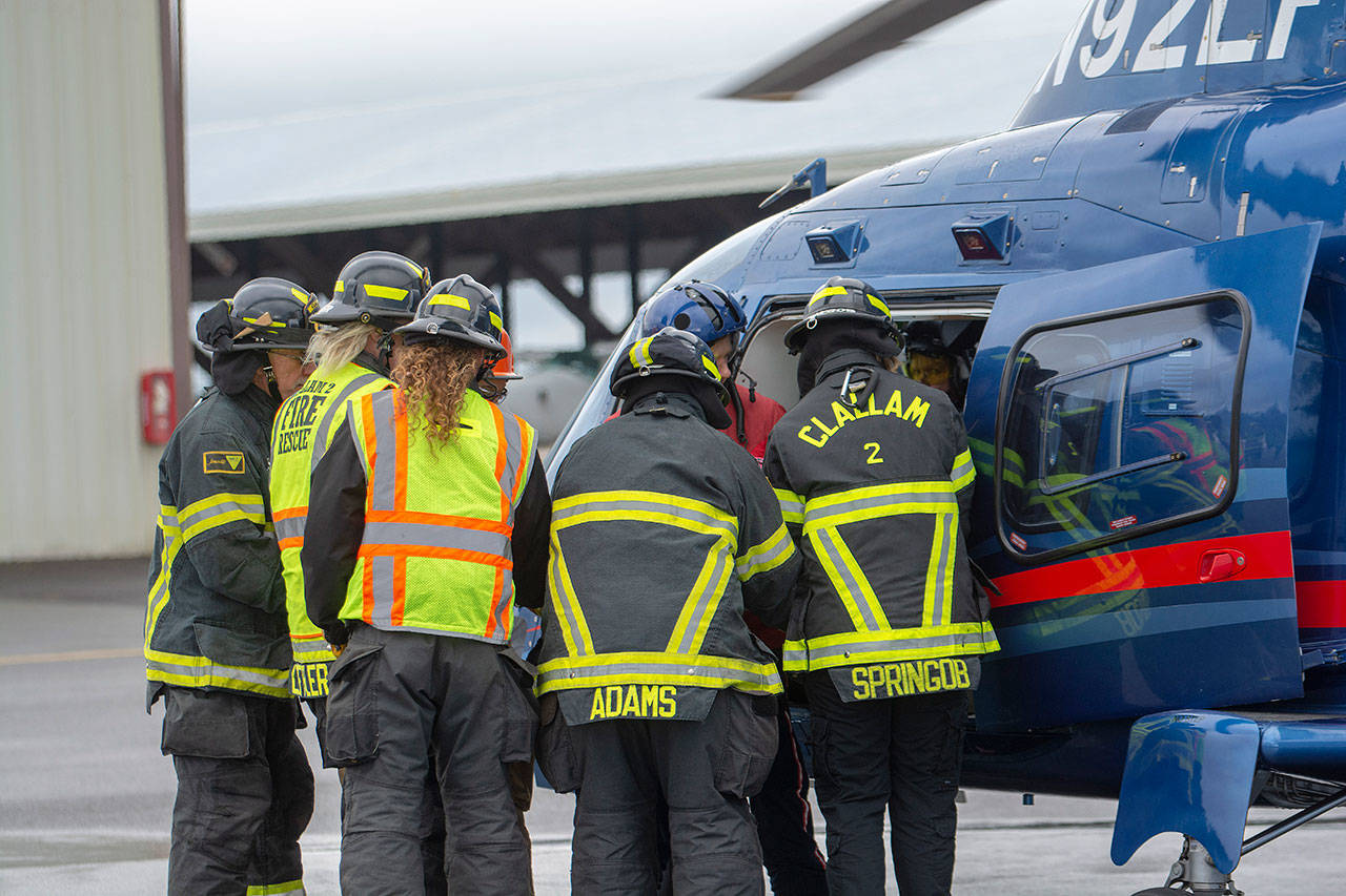 On Saturday, firefighters from Clallam Fire District No. 2, Clallam Fire District No. 4 and Port Angeles Fire Department trained with Life Flight, strapping mock patients in and loading them into the helicopter with the rotors whizzing just overhead.