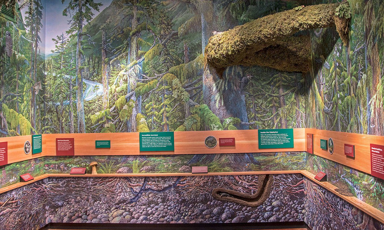 “The solution was to create an exploratory experience for diverse audiences of all ages and abilities. Visitors will find an engaging array of hands-on models such as a river otter, banana slug and Townsend’s mole; an immersive nook with expansive hand-painted murals; and an interactive rotational feature depicting the rain forest succession from fallen trees to nurse logs to colonnades.”