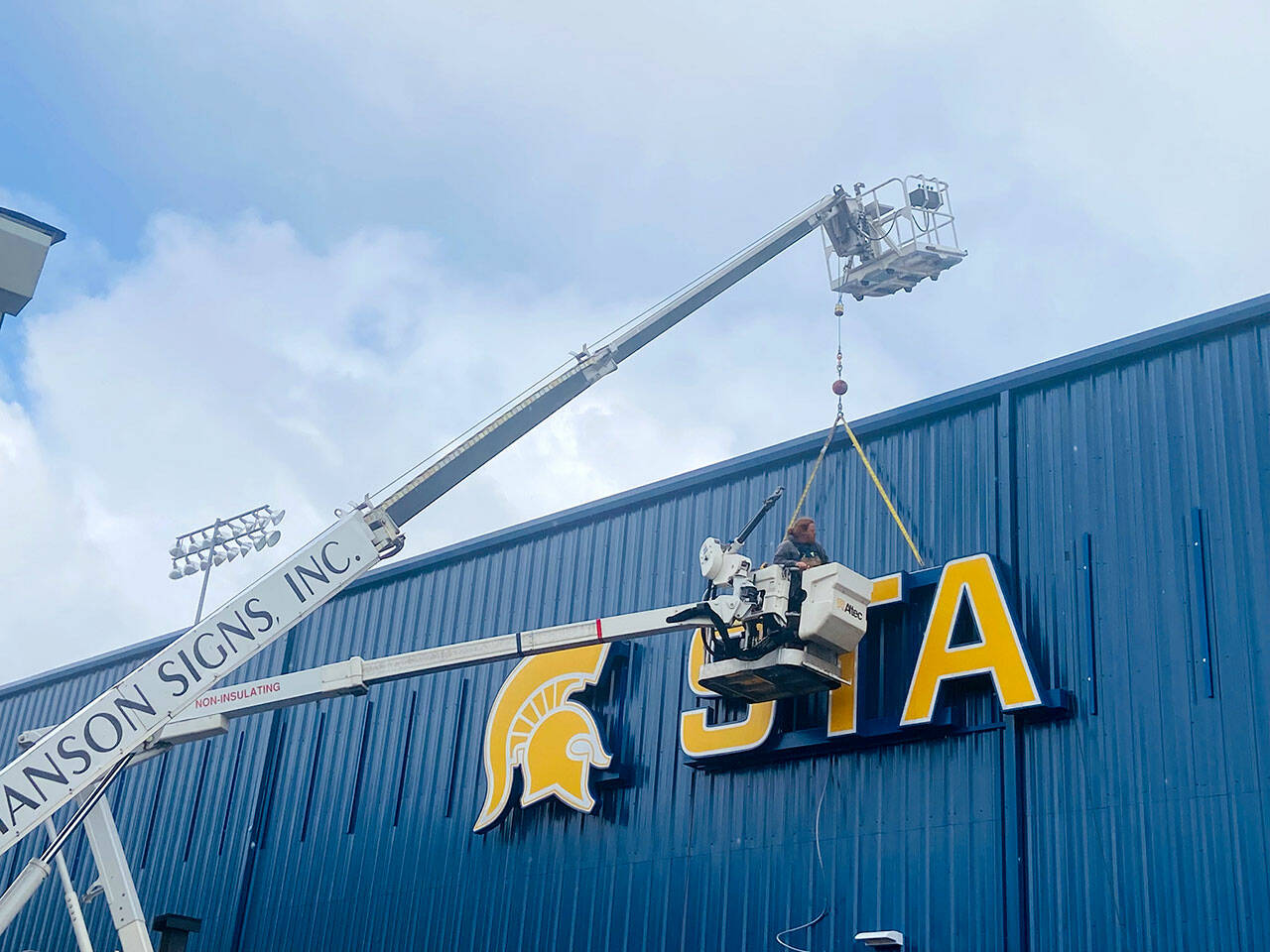 The stadium’s most eye-catching feature is a 96-foot-long, 6-foot-high gold illuminated Spartan Stadium sign on its west side. The $101,975 sign was fabricated in Tennessee and transported to Forks, where Hanson Signs of Silverdale installed it earlier this week.