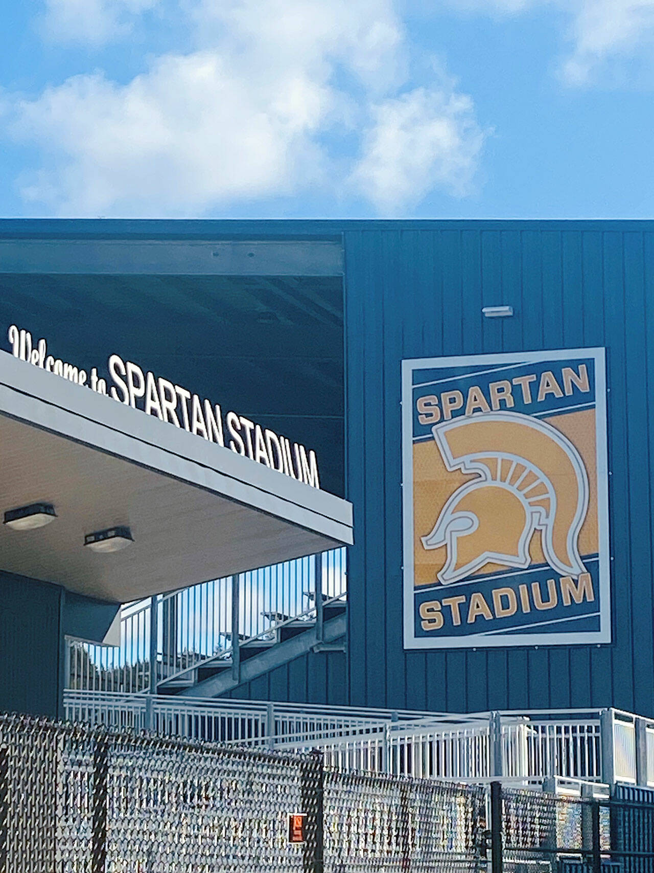A 14-foot-high, 10-foot-wide gold Spartan logo decorates the stadium’s north side. New fencing was installed around the stadium itself, and replacement fencing will surround the entire facility.