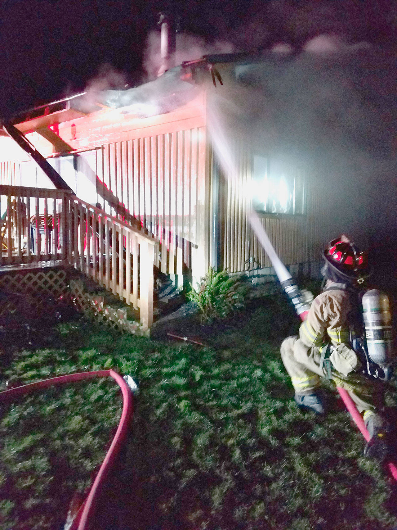 Firefighters arrived at 8:14 p.m. at the home south of Ole Torkelson Road. Flames were coming through the eaves in the corner of the house by the chimney when they arrived, according to the release.