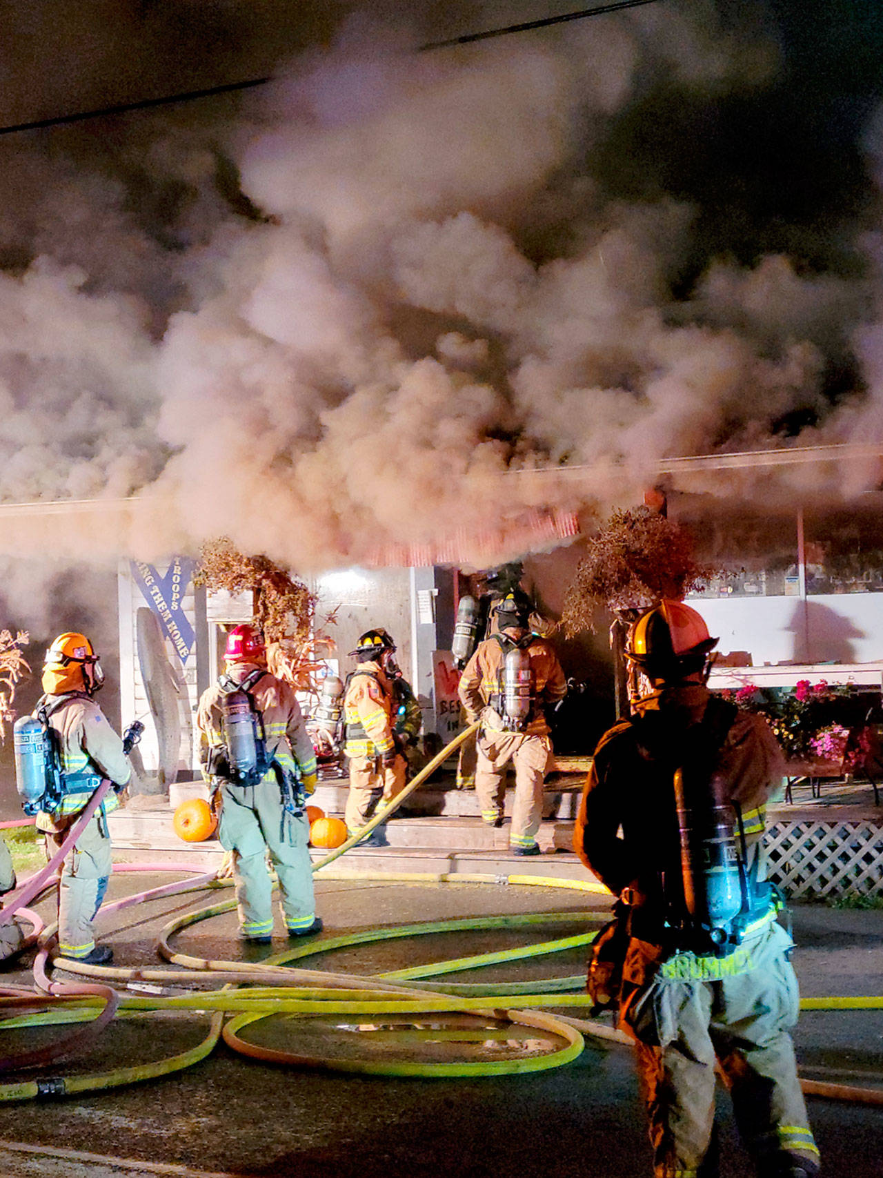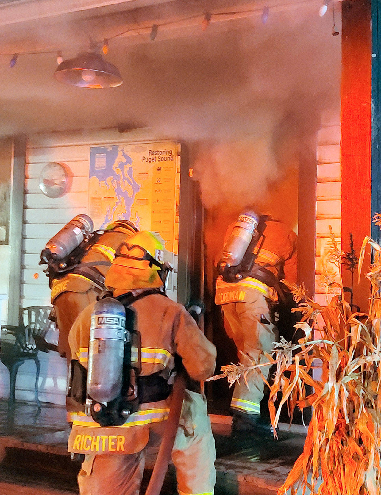 Firefighters from EJFR, Naval Magazine Indian Island, Port Ludlow Fire Rescue and Quilcene Fire Rescue arrived to find smoke billowing from the building. Upon cutting a hole in the roof, firefighters discovered flames in the building’s attic and extinguished the blaze by 3:30 a.m., according to EJFR.