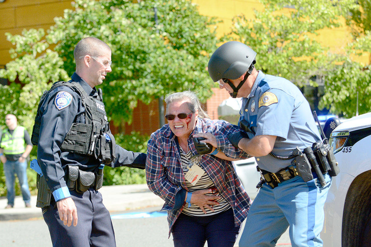 After simulated explosions, officers from federal, state and local agencies rushed through Keegan Hall at the Peninsula College campus in Port Angeles and quickly confronted two mock shooters — quicker than training officers had planned.