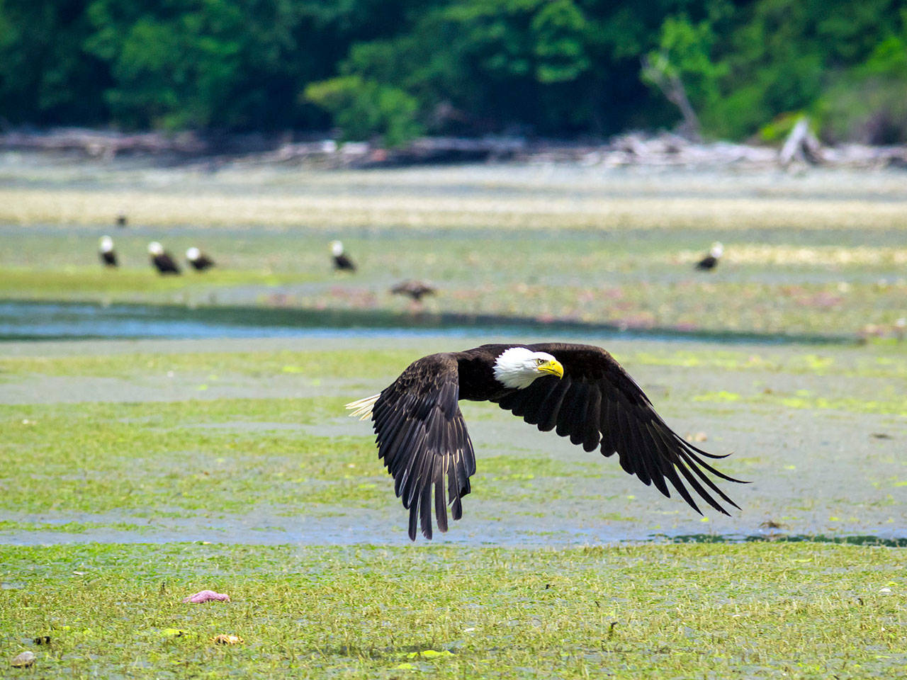 Researchers found that the Dabob Bay eagles were hunting midshipmen under clumps of oysters or in rocks. Foraging was tied closely to the tidal cycle, with gatherings occurring in larger numbers during low tides and more fish captured during outgoing tides.