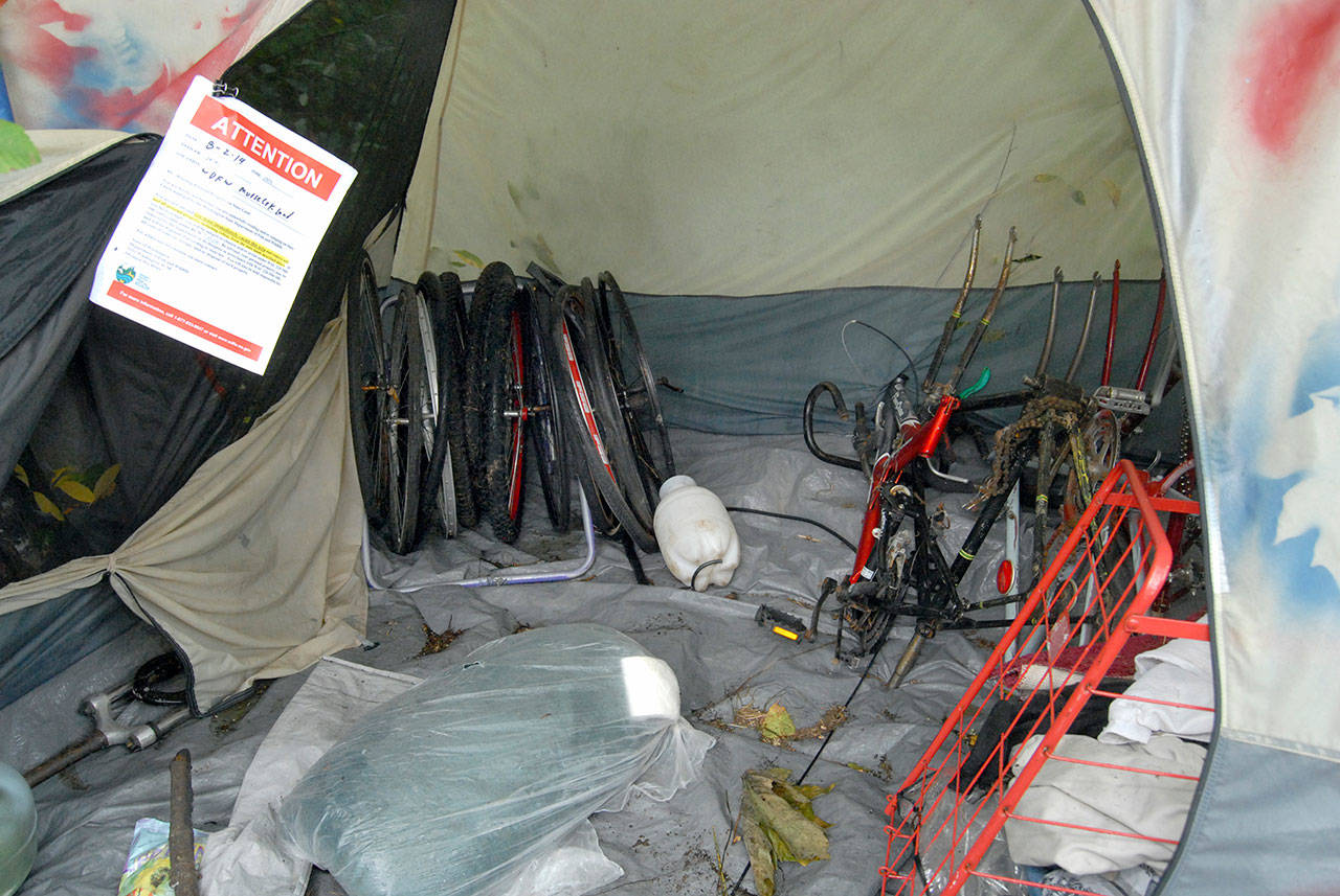 The officers found a common dumping area with 30 bags of garbage near the entrance of the property, and deeper within the parcel an apparent barter tent with three bike frames and a dozen tires and rims stored inside.