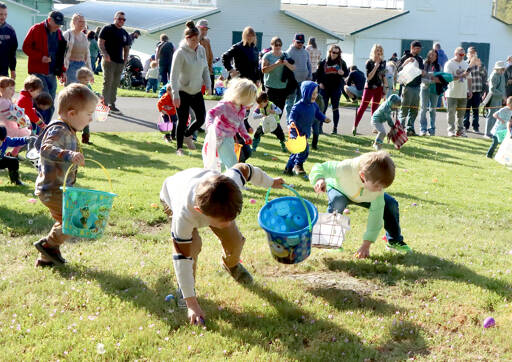 The 47th annual KONP Easter Egg Hunt was conducted Saturday at the Clallam County Fairgrounds in Port Angeles. Here, the 3- to 5-year-olds rush to gather up plastic eggs. (Dave Logan/for Peninsula Daily News)