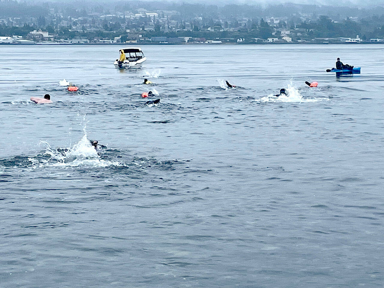 Orca Bait Swim participants were guided from the start near the Coast Guard boat launch on Ediz Hook to Pebble Beach by kayakers and paddle boarders. Everyone who ran into the chilly water made it to the other side of the harbor.