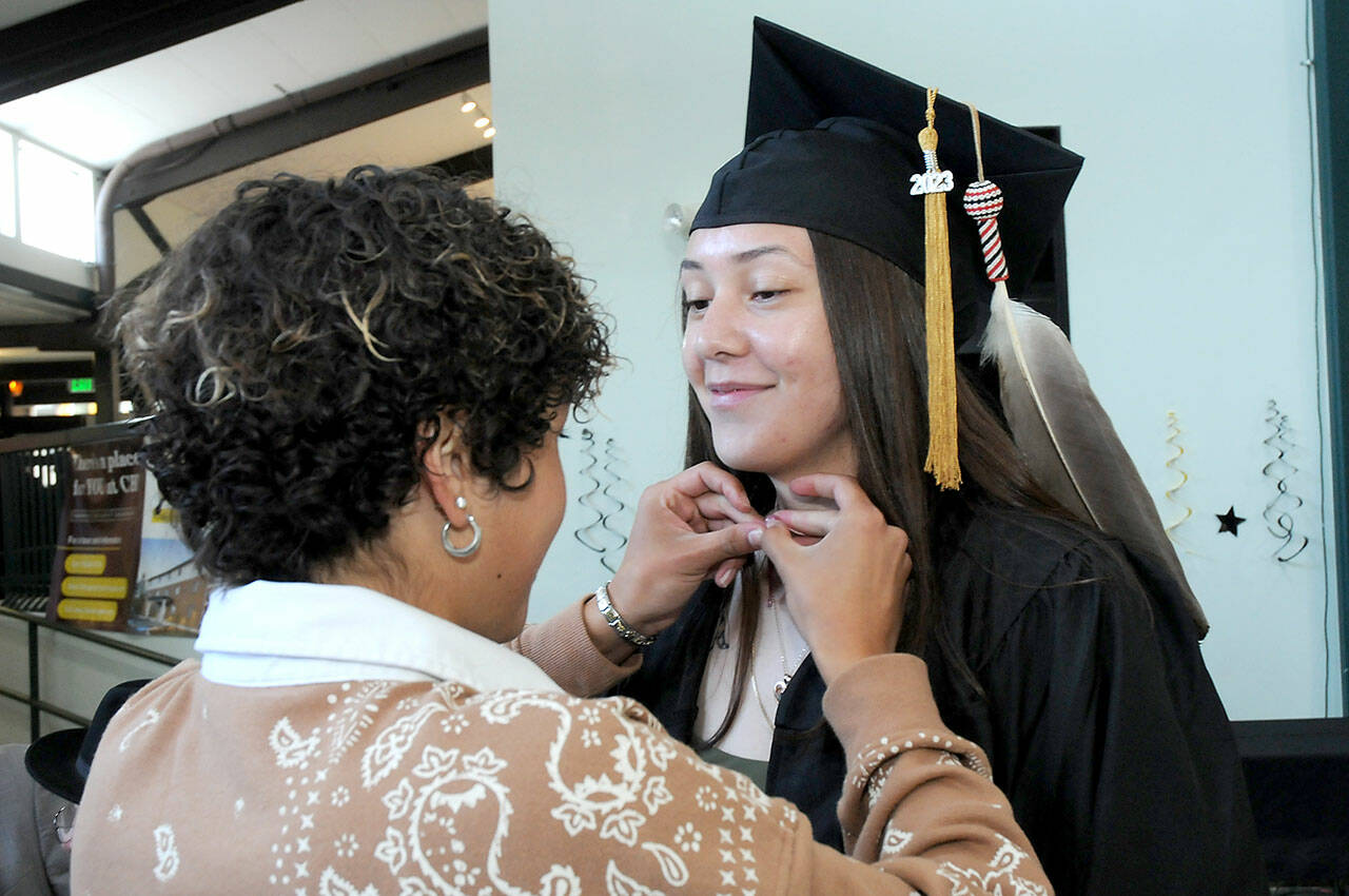 Peninsula College graduate Audrey Pilatti of Neah Bay, right, gets assistance with a necklace from her sister, Edna Pilatti, prior to commencement on Saturday on the school’s Port Angeles campus. A total of 388 degrees and certificates were awarded for the 2022-23 school year with 270 people signed up to participate in either of two ceremonies. (Keith Thorpe/Peninsula Daily News)