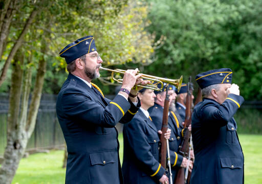 Rick Castellano of Whidbey Island stands beside the honor guard as he plays Taps during a Memorial Day Service at the military cemetery at Fort Worden State Park on Monday. (Steve Mullensky/for Peninsula Daily News)