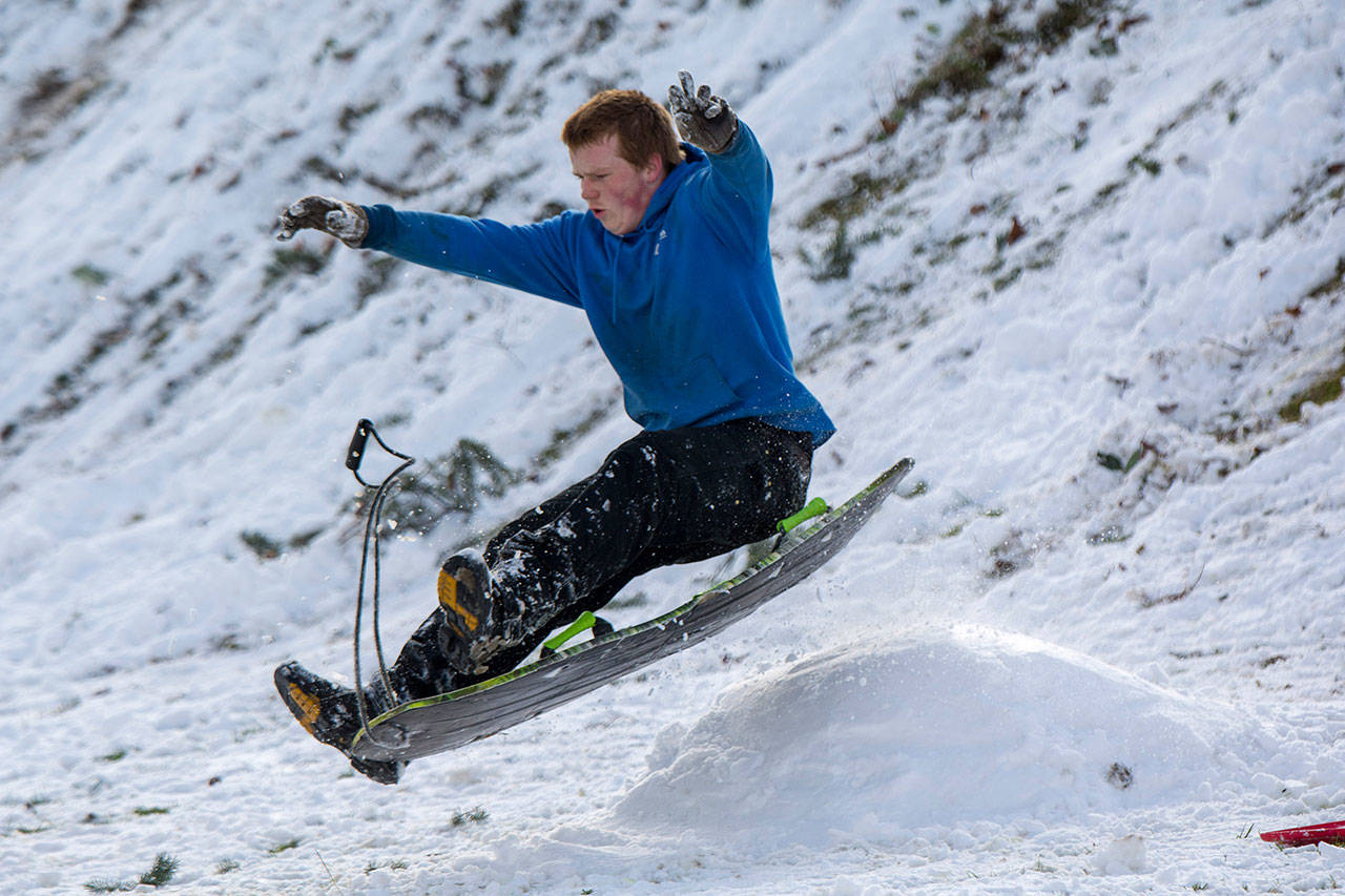 Tryton Bondy, 9, of Port Angeles loses control of his sled after going over a jump at the bottom of a hill at Stevens Middle School on Monday. (Jesse Major/Peninsula Daily News)