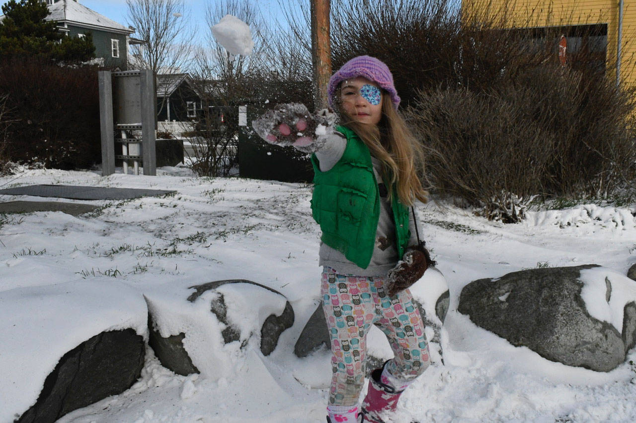 Agnes Ruth, 7, of Port Townsend spent her day off from school sledding and having snowball fights with her little brother, Abraham. She said she had fun on her unexpected vacation day and warmed up between battles with hot tea with her mom. (Jeannie McMacken/Peninsula Daily News)