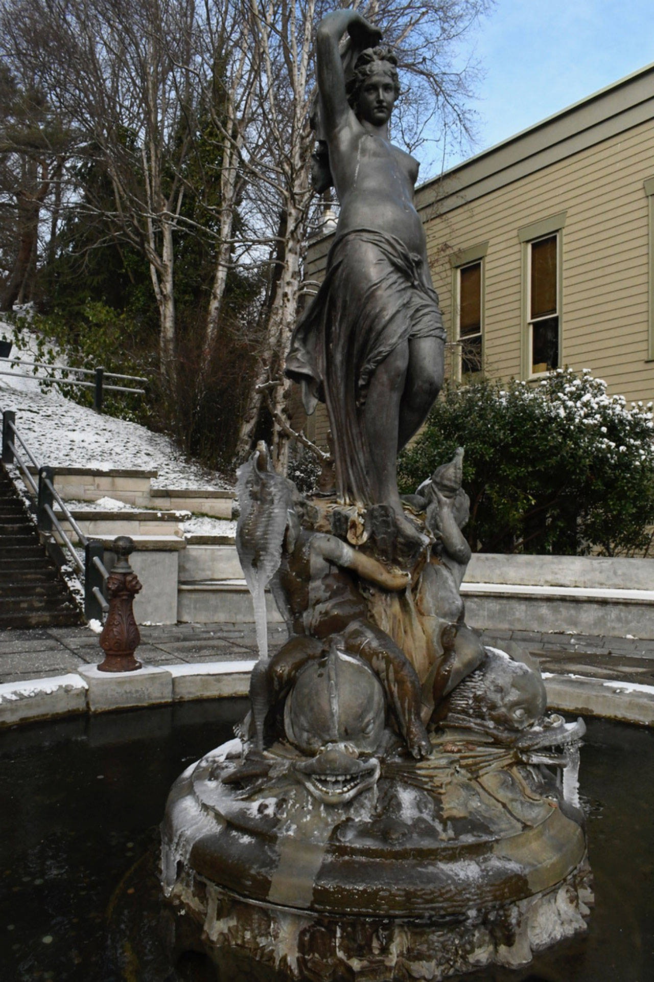 Galatea and her cherubs weathered the storm but the Haller Fountain in Port Townsend was frozen Monday even though the sun appeared midday. (Jeannie McMacken/Peninsula Daily News)