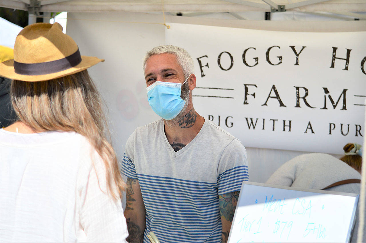Farmer Anderson Mackenzie, who works at Foggy Hog Farm of Port Townsend, debuted his products at the Port Townsend Farmers Market last Saturday. He spoke with prospective buyers one at a time about the operation’s community-supported agriculture (CSA) shares, its sausages and its “A pig with a purpose” motto.