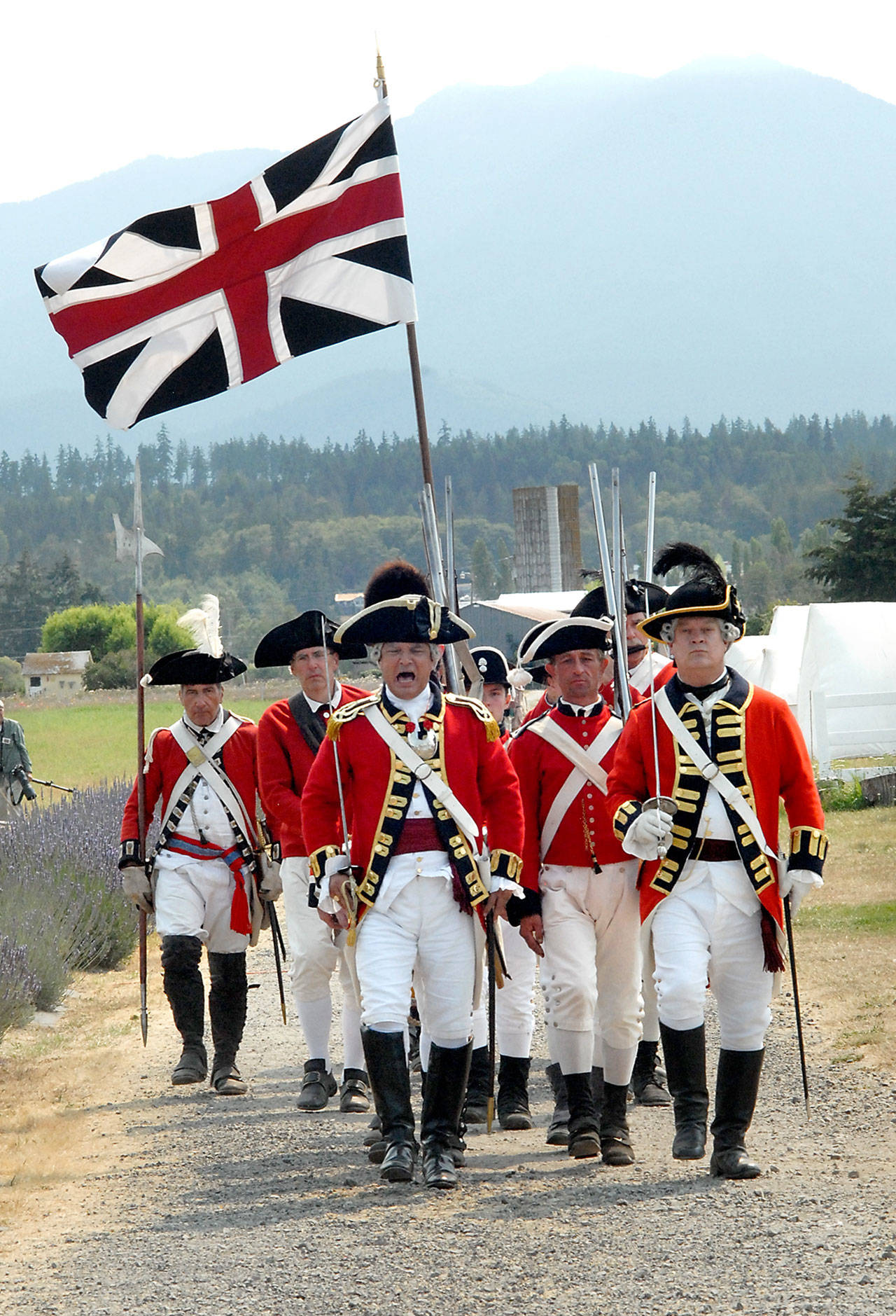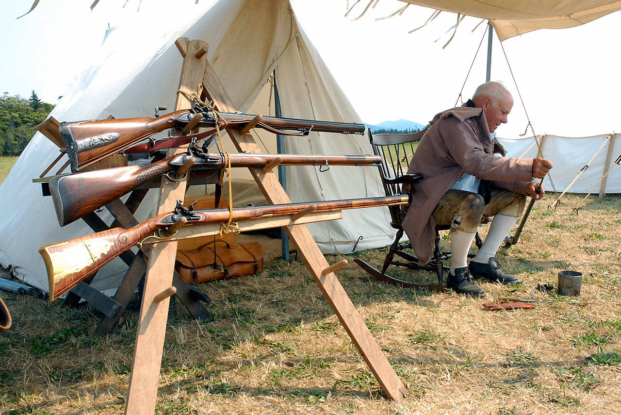 Colonial reenactor Bill Sick of Yelm cleans a replica of an musket rifle near a display of weapons modled from the era. (Keith Thorpe/Peninsula Daily News)