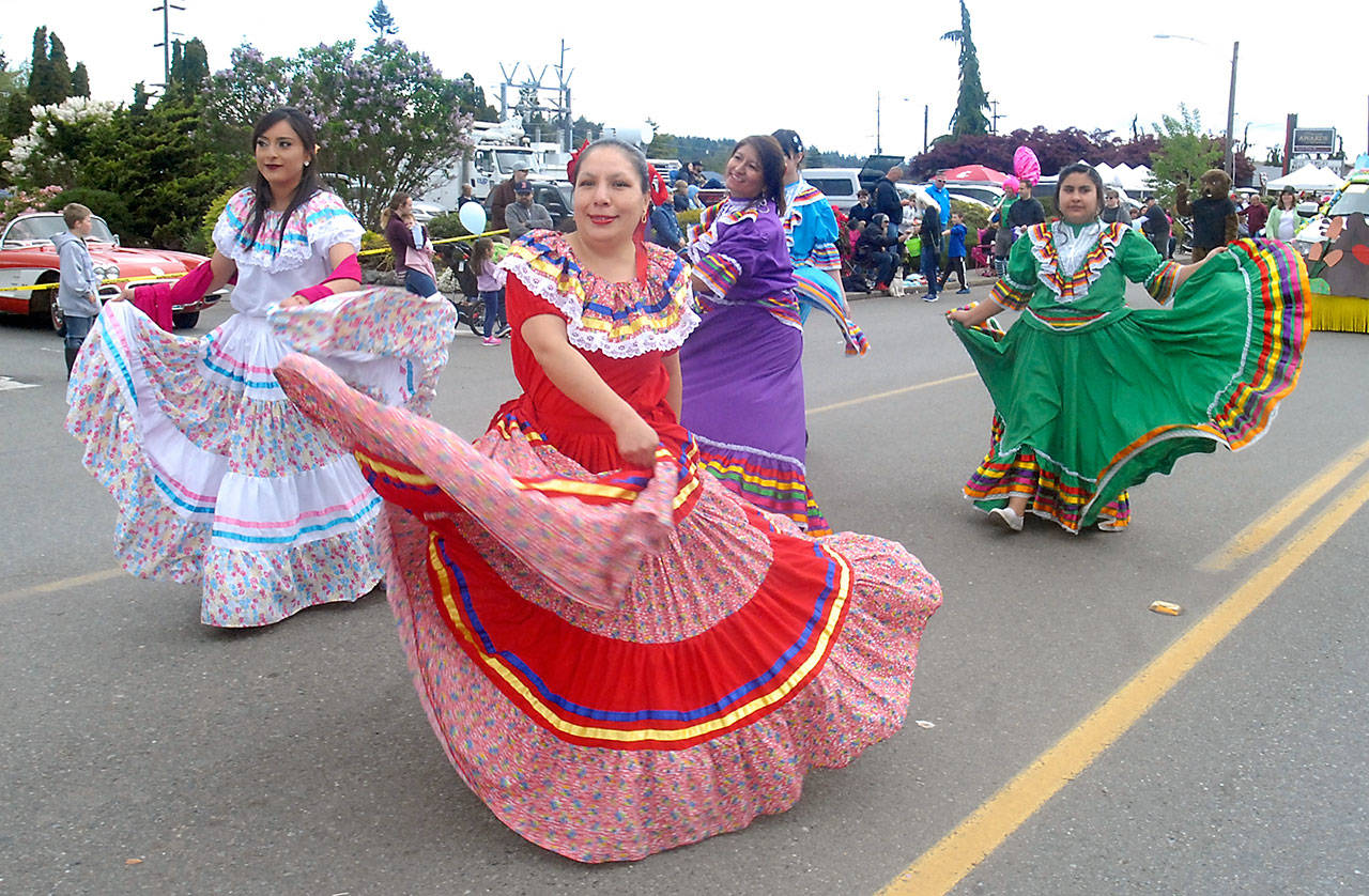 Dancers from the Mexican Community of Sequim parade entry create a swirl on color Saturday. (Keith Thorpe/Peninsula Daily News)