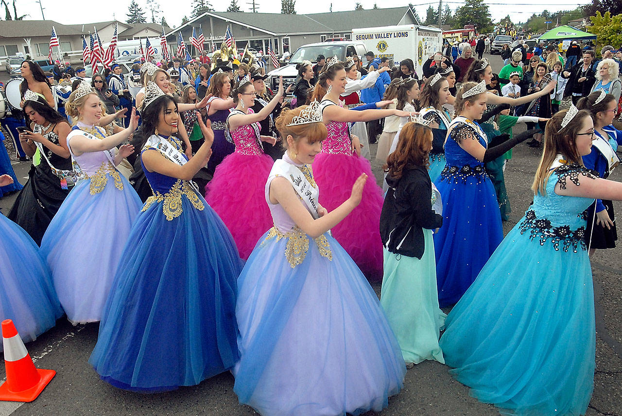 Royalty from a variety of Western Washington festivals gather to dance the “Macarena” before the start of Saturday’s Irrigation Festival Grand Parade. (Keith Thorpe/Peninsula Daily News)