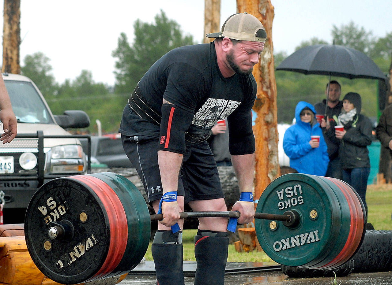 Nate Bolling of Sequim attempts to lift 750 pounds during Friday’s Irrigation Festival Strong Man competition at the Blake Property in Sequim. (Keith Thorpe/Peninsula Daily News)