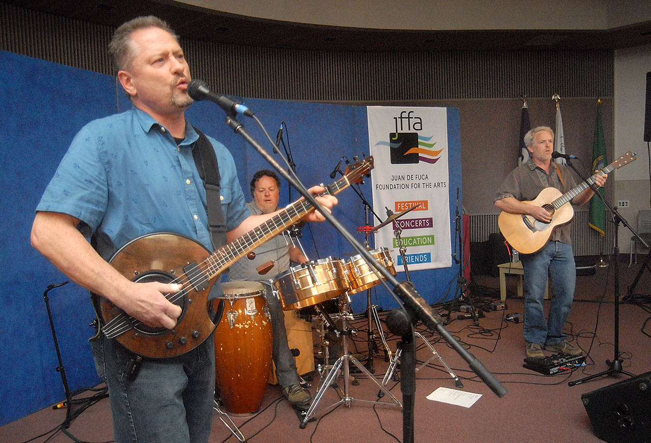 Members of Port Angeles-based Joy In Mudville, from left, Paul Stehr-Green, Kim Trenerry and Jason Mogi, entertain the audience on Friday from the Main Stage of the Juan de Fuca Festival of the Arts. (Keith Thorpe/Peninsula Daily News)