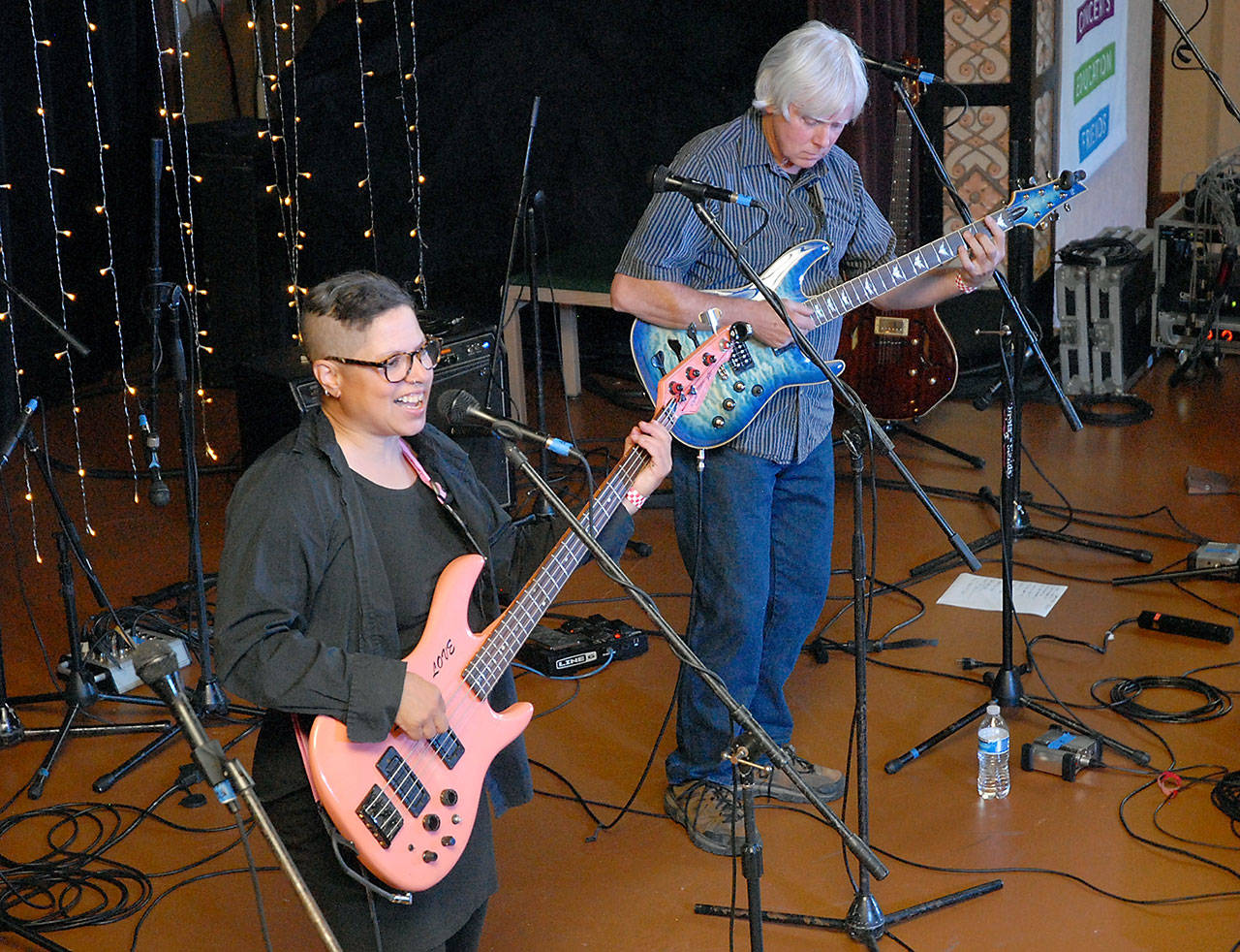 Seattle-based folk-funk singer and bassist Laura Love, left, and her guitarist, Terry Hunt, rock out on the ballroom stage at the Navel Elks Lodge during her Saturday afternoon performance. (Keith Thorpe/Peninsula Daily News)