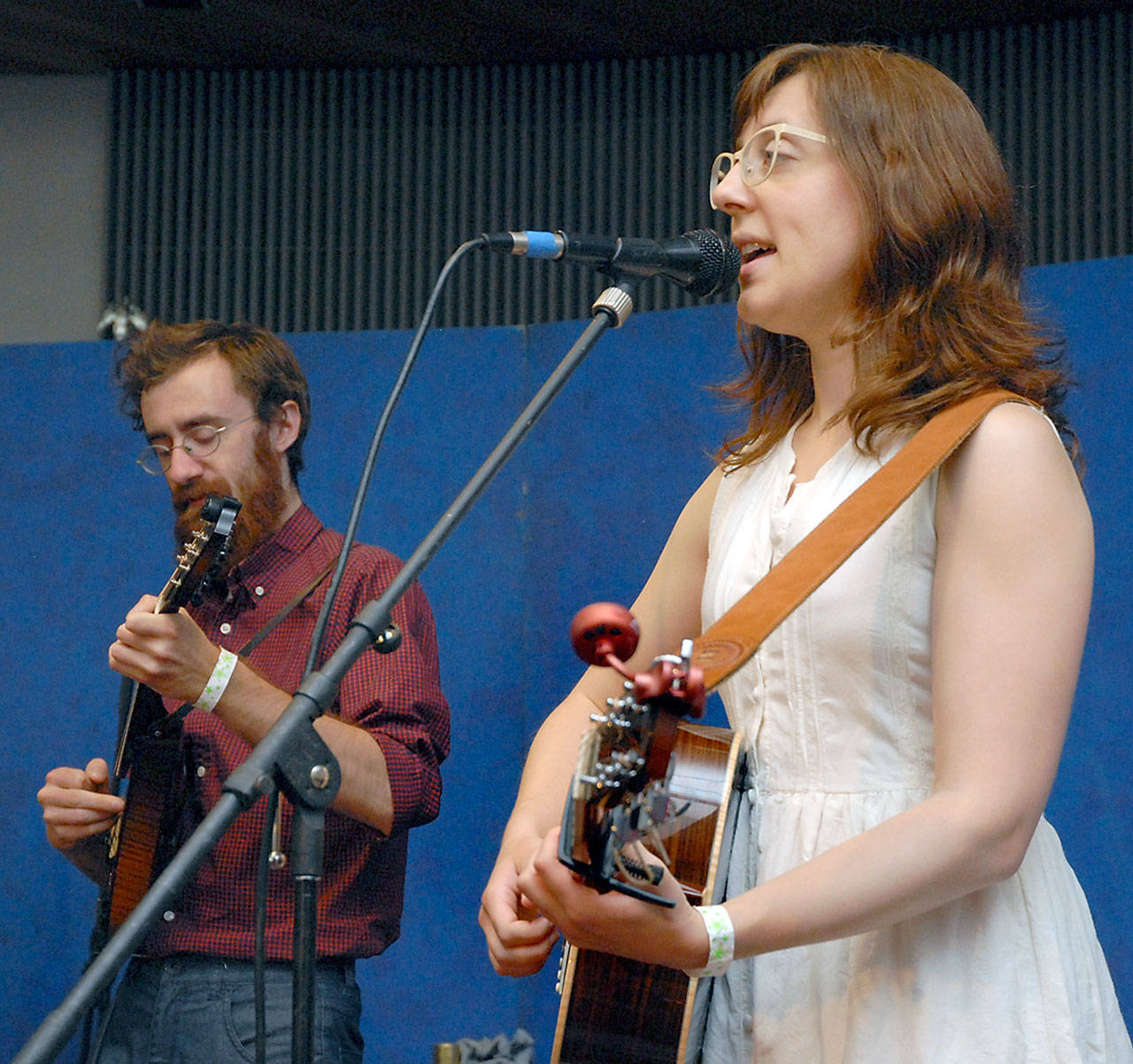 Mandolinist Alex Rempel, left, and singer/instrumentalist Eden Oliver entertain from the Juan de Fuca Festival’s Chamber Stage with their Victoria-based group West My Friend on Saturday. (Keith Thorpe/Peninsula Daily News)