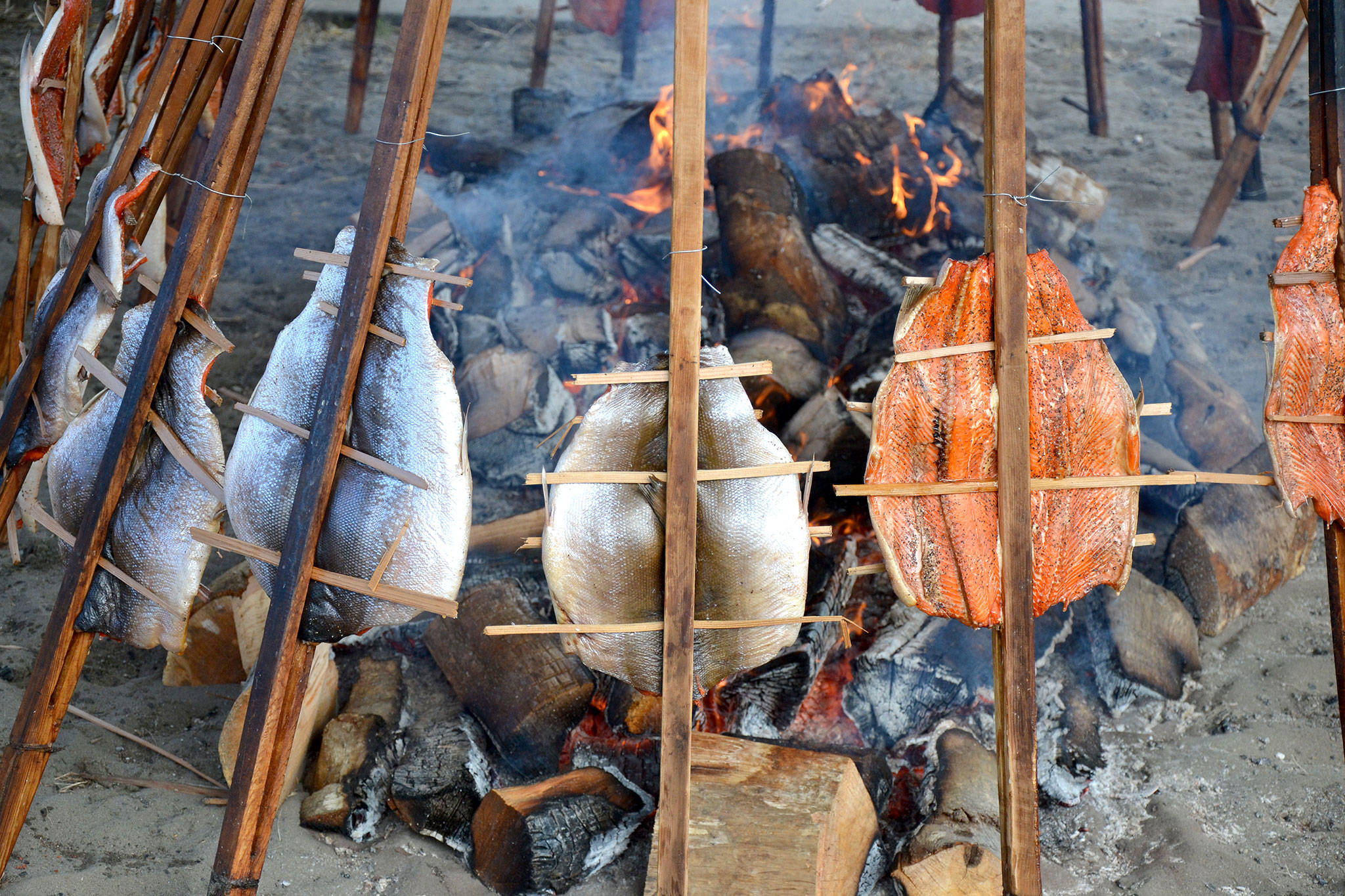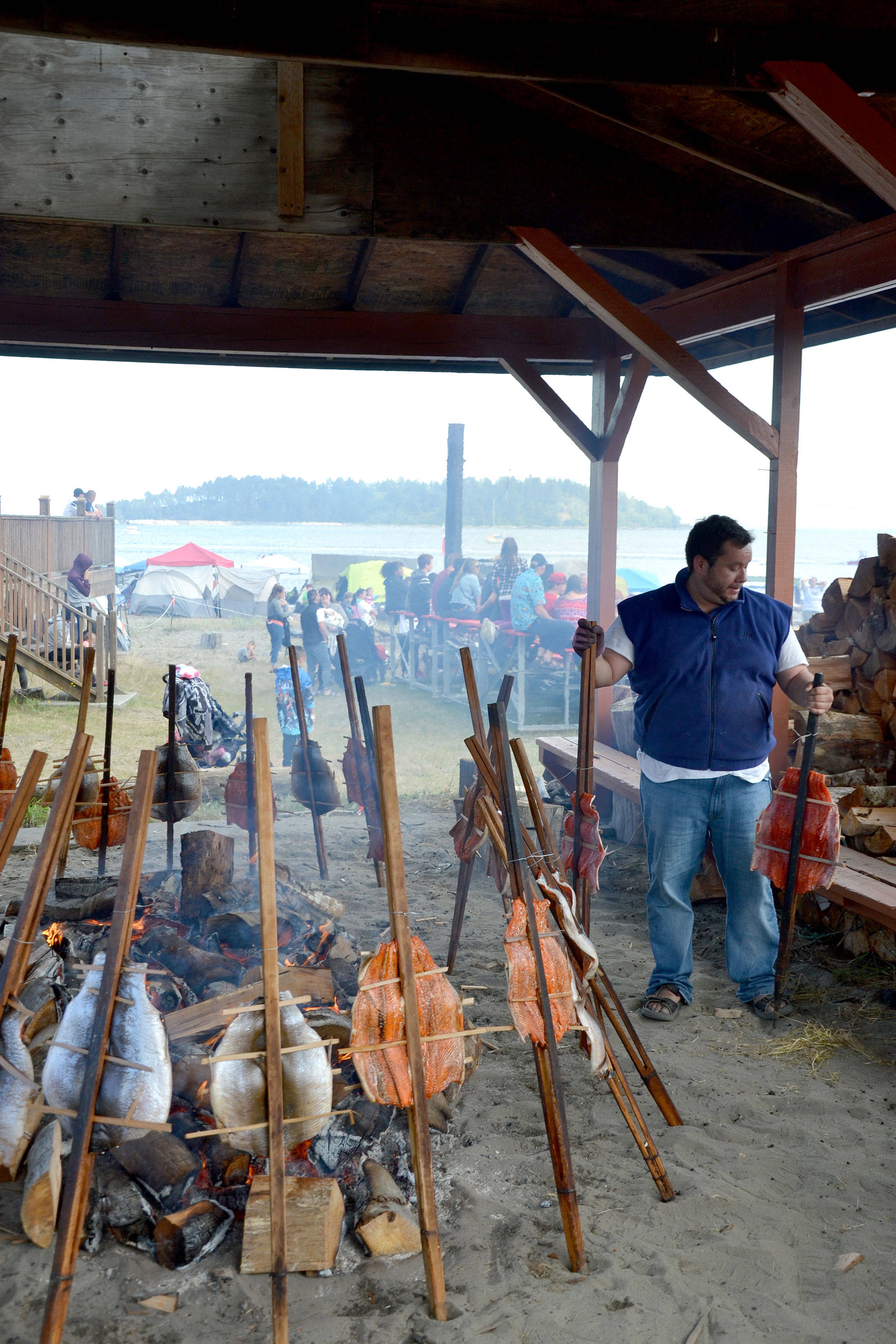 Held Aug. 23-25, people gathered to taste the traditional salmon bake, which was maintained by the Makah Days Salmon Bake Crew. Sockeye fillets from Cape Flattery Fishermen’s Cooperative were flown in for the bake.