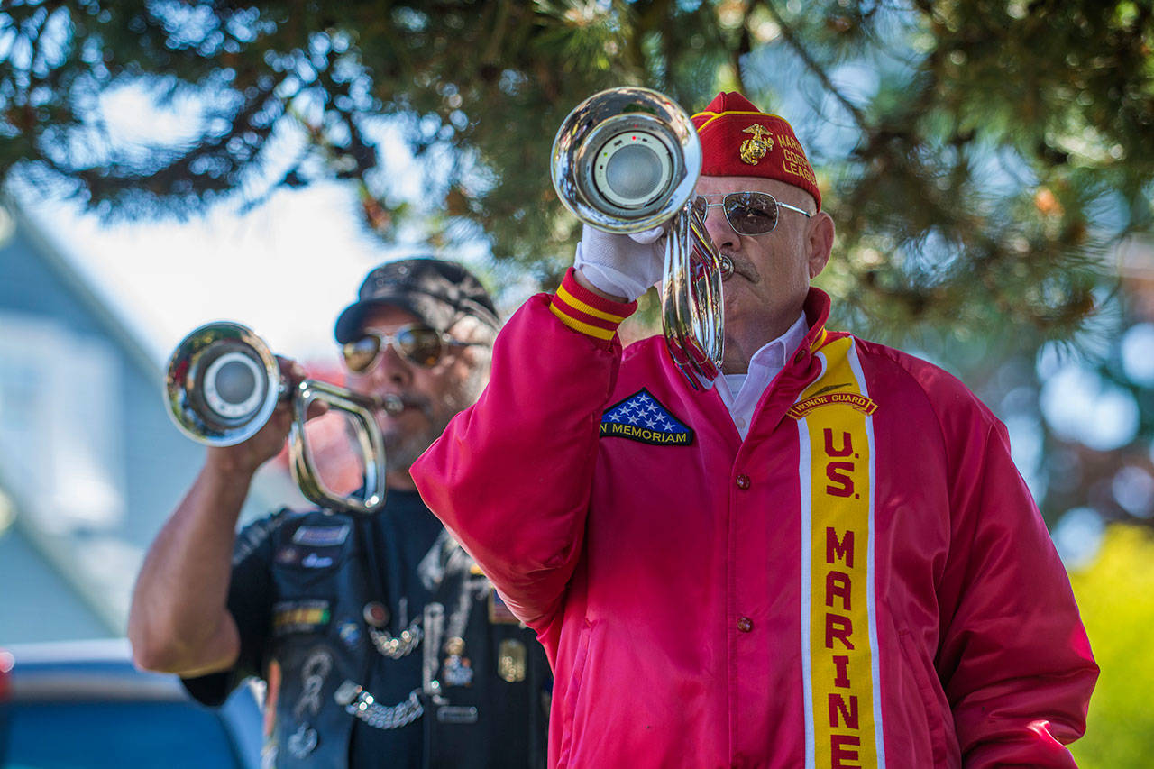 American Legion Rider Sam Klippert, left, and Marine Corps League Honor Guard member Guy Iredale, right, perform Taps together at the Captain Joseph House Memorial Service on Sunday. (Jesse Major/Peninsula Daily News)