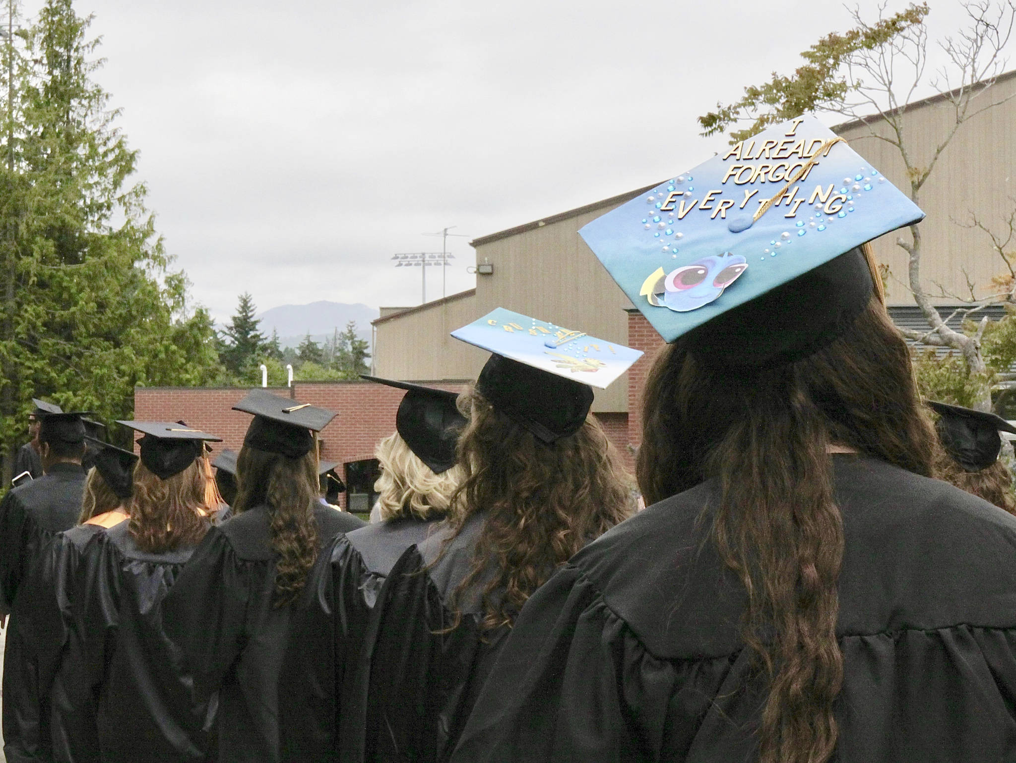 Graduation humor found on the top of a mortarboard as the graduates walk across campus to the ceremony site on the back lawn Saturday at Peninsula College. (Dave Logan/for Peninsula Daily News)