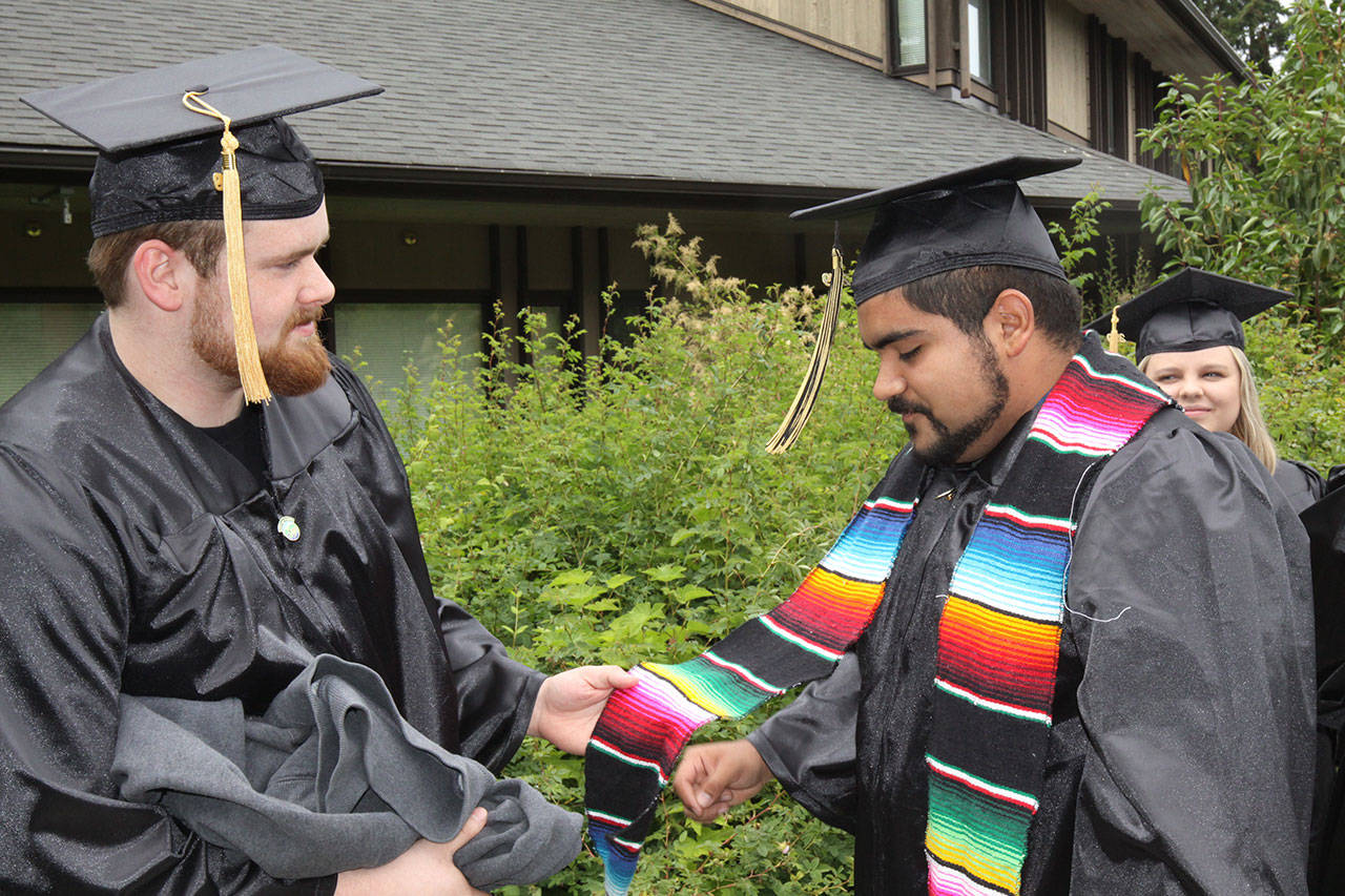 Caleb Peters, left, admires the colorful graduation sash worn by Eden Cisneros. Both students are from Forks and June 8 graduated from Forks High School. On Saturday, they were graduated from Peninsula College as part of the Running Start Program. (Dave Logan/for Peninsula Daily News)