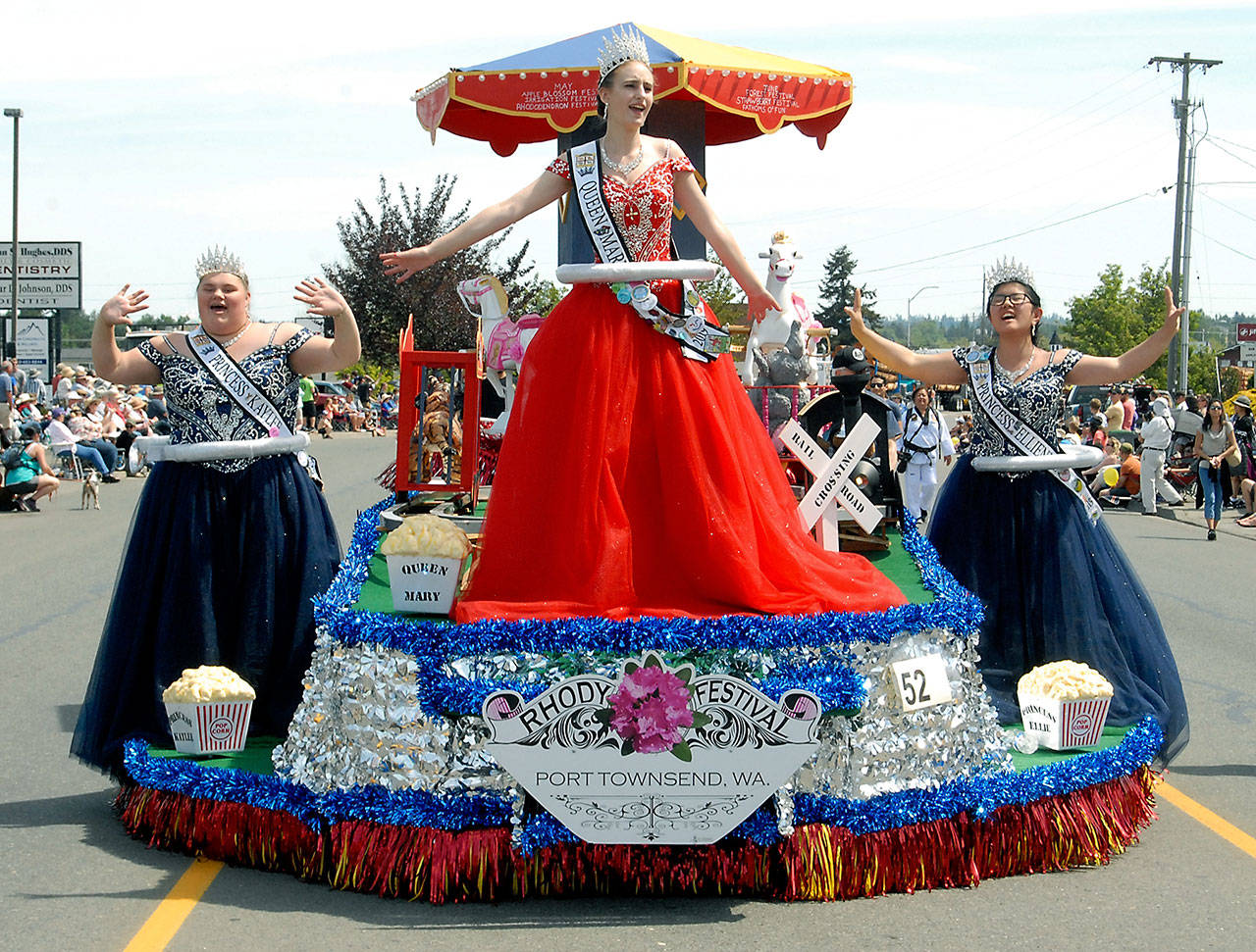The 2019 Rhododendron Festival royalty, from left, Princess Kaylee Krajewski, Queen Mary Neville and Princess Ellie Thornton ride on their float during Saturday’s Irrigation Festival in Sequim. (Keith Thorpe/Peninsula Daily News)