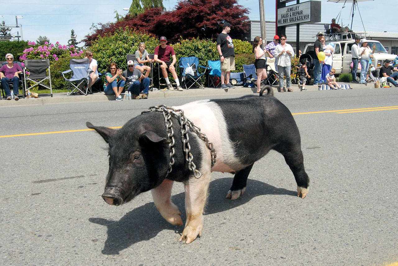 A pig named 8-ball marches down Washington Street in Sequim during Saturday’s Irrigation Festival Grand Parade. The porcine parade entry, which rapidly became a crowd favorite, was part of an entry for Pampered Pork show pigs and homegrown pork. (Keith Thorpe/Peninsula Daily News)