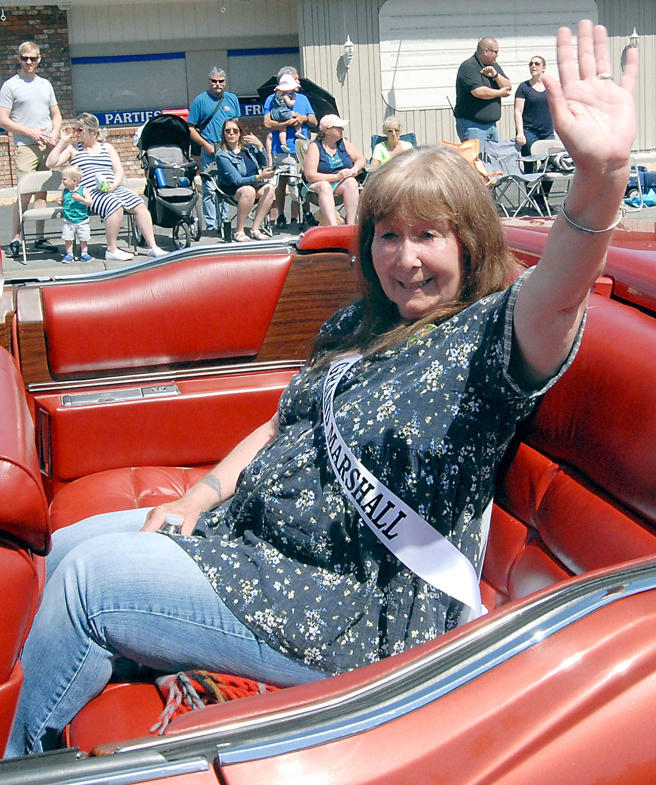 Sequim Irrigation Festival parade Grand Marshal Jaye Moore, retired director of the Northwest Raptor and Wildlife Center, waves to the crowd on Saturday. (Keith Thorpe/Peninsula Daily News)