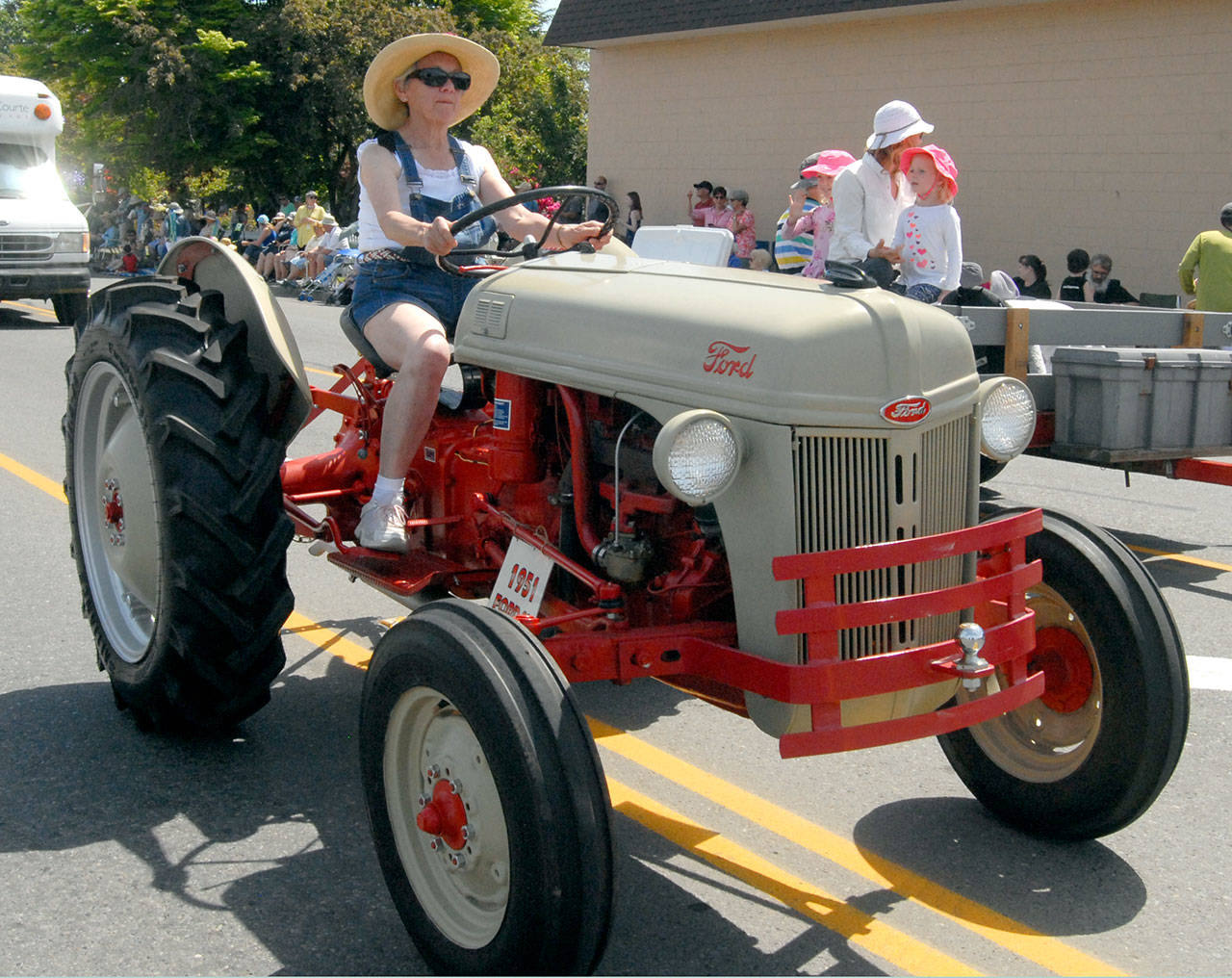 Kay Emmeret drives a vintage 1951 Ford tractor as part of a parade entry for Lonnie Love. (Keith Thorpe/Peninsula Daily News)
