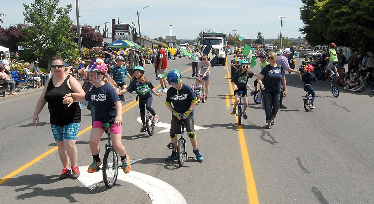 Youth unicyclists from Hamilton School in Port Angeles entertain parade-goers on Saturday. (Keith Thorpe/Peninsula Daily News)